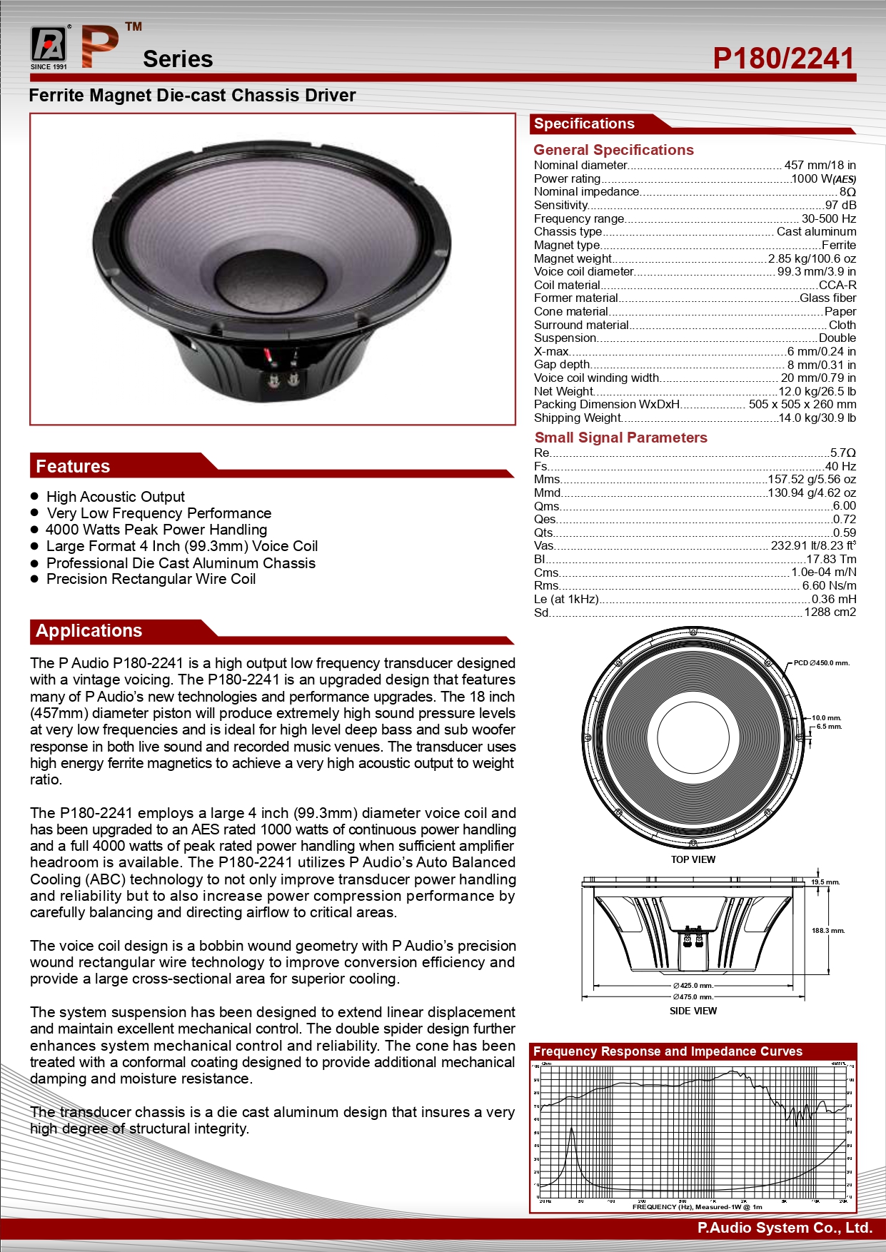 - The P Audio P180-2241 is a high output low frequency transducer designed with a vintage voicing. The P180-2241 is an upgraded design that features many of P Audio’s new technologies and performance upgrades. The 18 inch (457mm) diameter piston will produce extremely high sound pressure levels at very low frequencies and is ideal for high level deep bass and sub woofer response in both live sound and recorded music venues. The transducer uses high energy ferrite magnetics to achieve a very high acoustic output to weight ratio.The P180-2241 employs a large 4 inch (99.3mm) diameter voice coil and has been upgraded to an AES rated 1000 watts of continuous power handling and a full 4000 watts of peak rated power handling when sufficient amplifier headroom is available. The P180-2241 utilizes P Audio’s Auto Balanced Cooling (ABC) technology to not only improve transducer power handling and reliability but to also increase power compression performance by carefully balancing and directing airflow to critical areas.