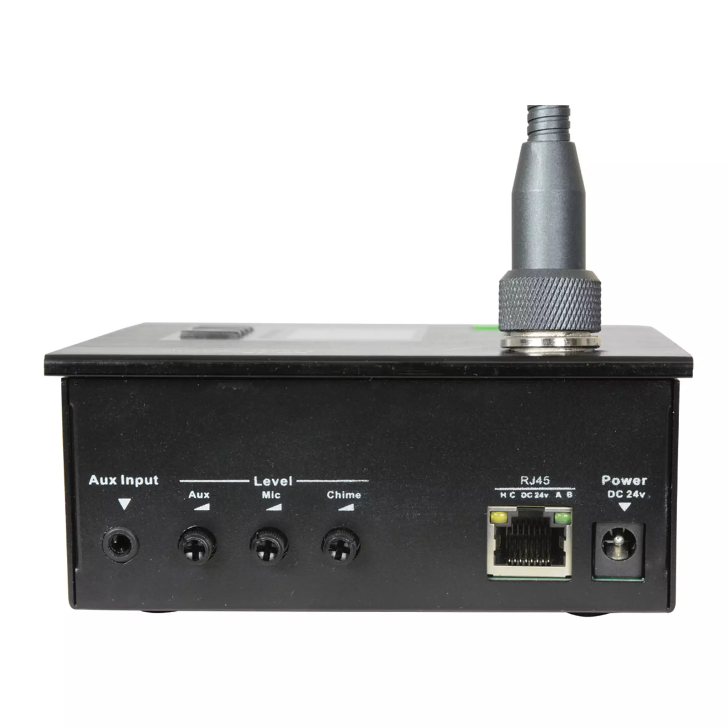 - Connectors: RJ45 to amplifier, 24Vdc power jack, 3.5mm aux in