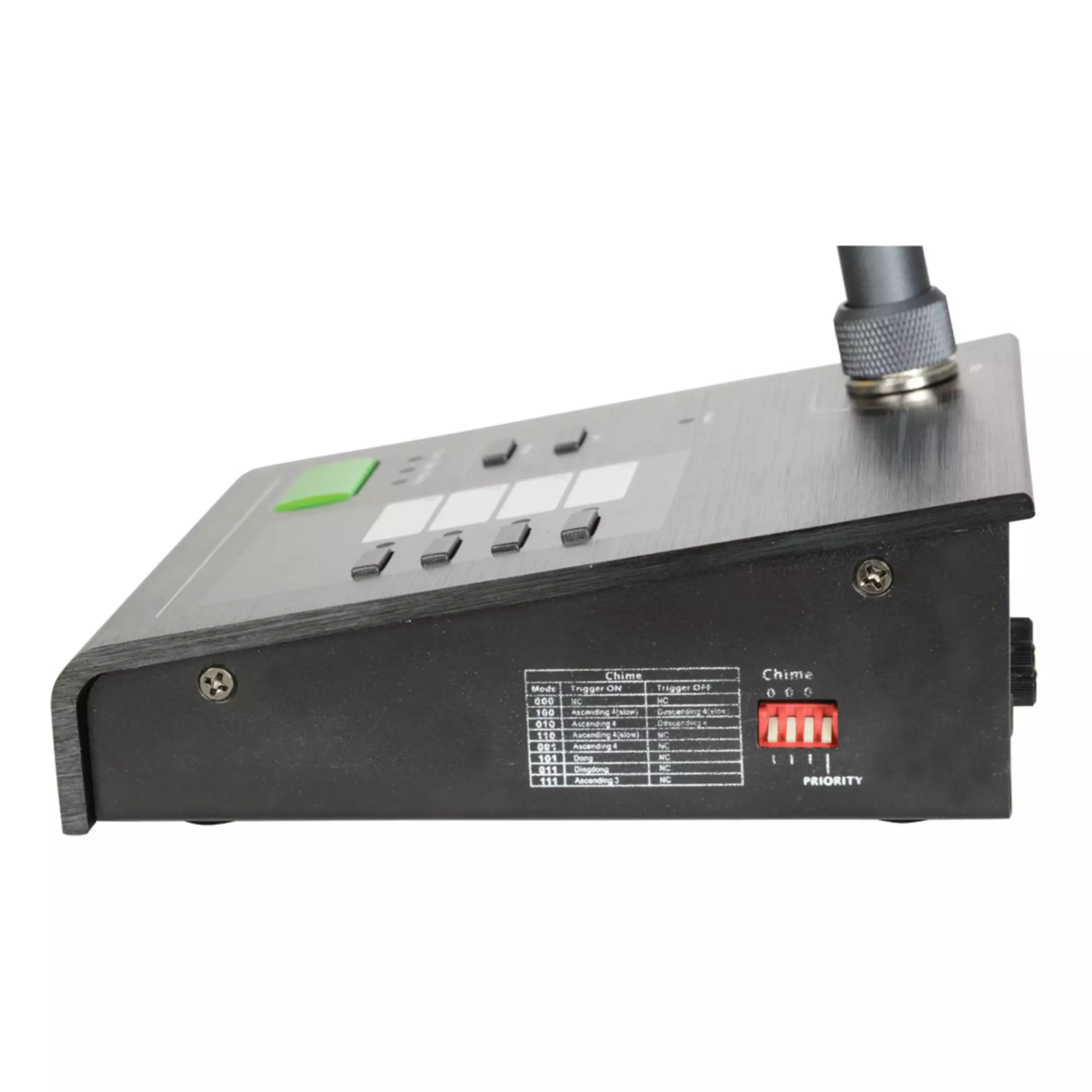 - Controls: Aux/Mic/Chime levels, chime DIP switches, zone/page buttons