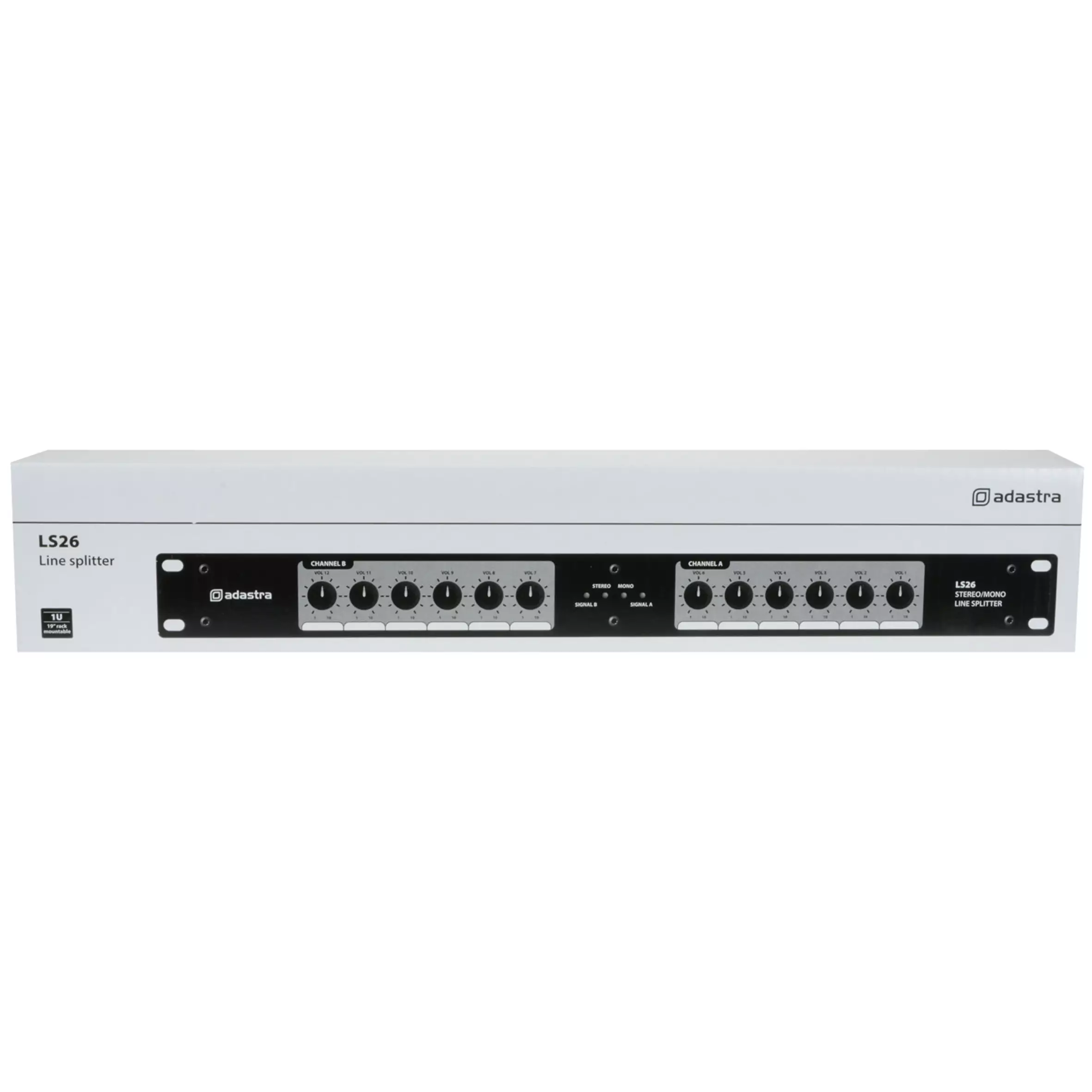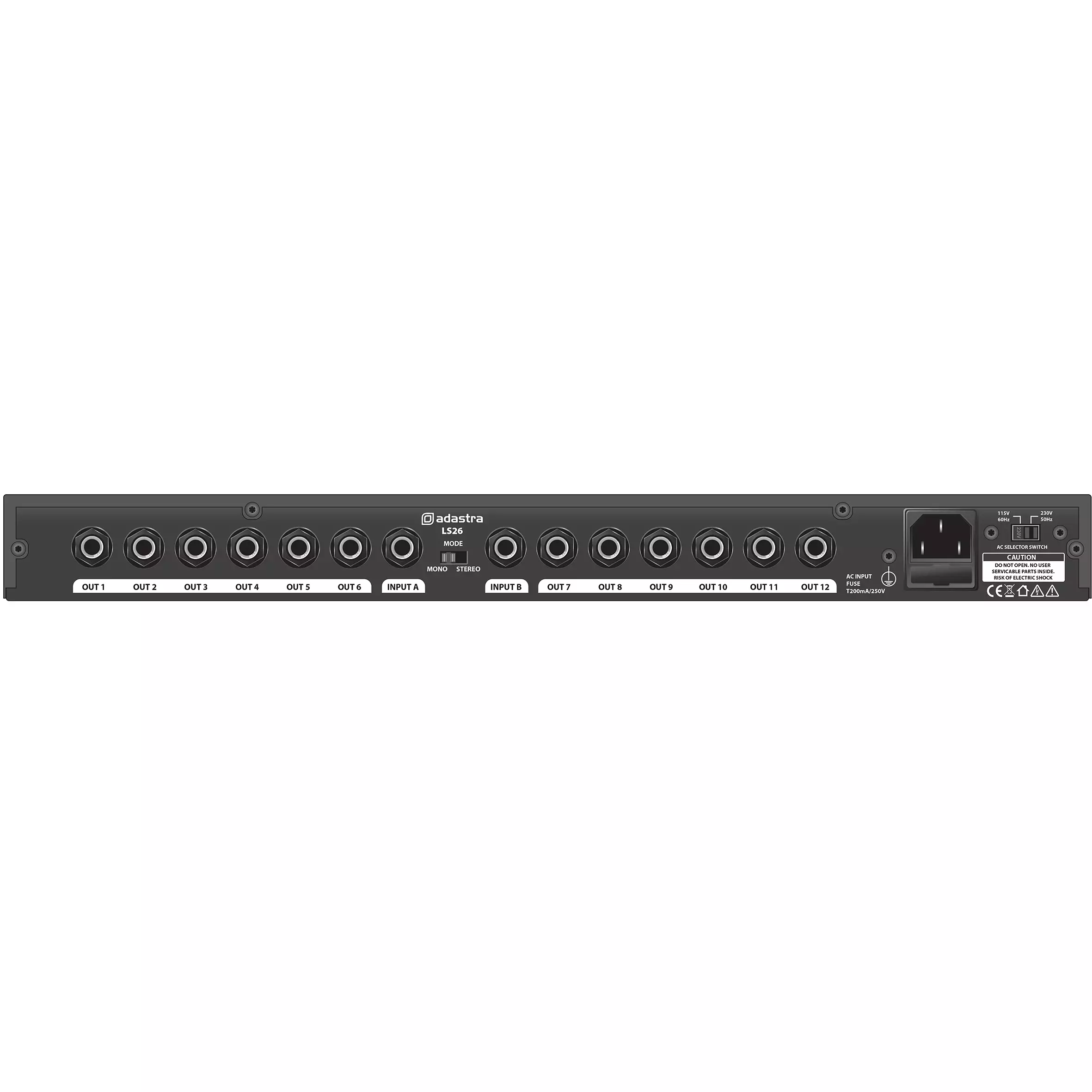 Signal splitter with 2 line inputs which are buffered and divided across 6 outputs each. Can be used as a 6-way stereo splitter or can be switched as a mono system feeding all 12 outputs from input A. Applications include zone mixing, personal monitoring, effects patching and routing in complex recording setups.