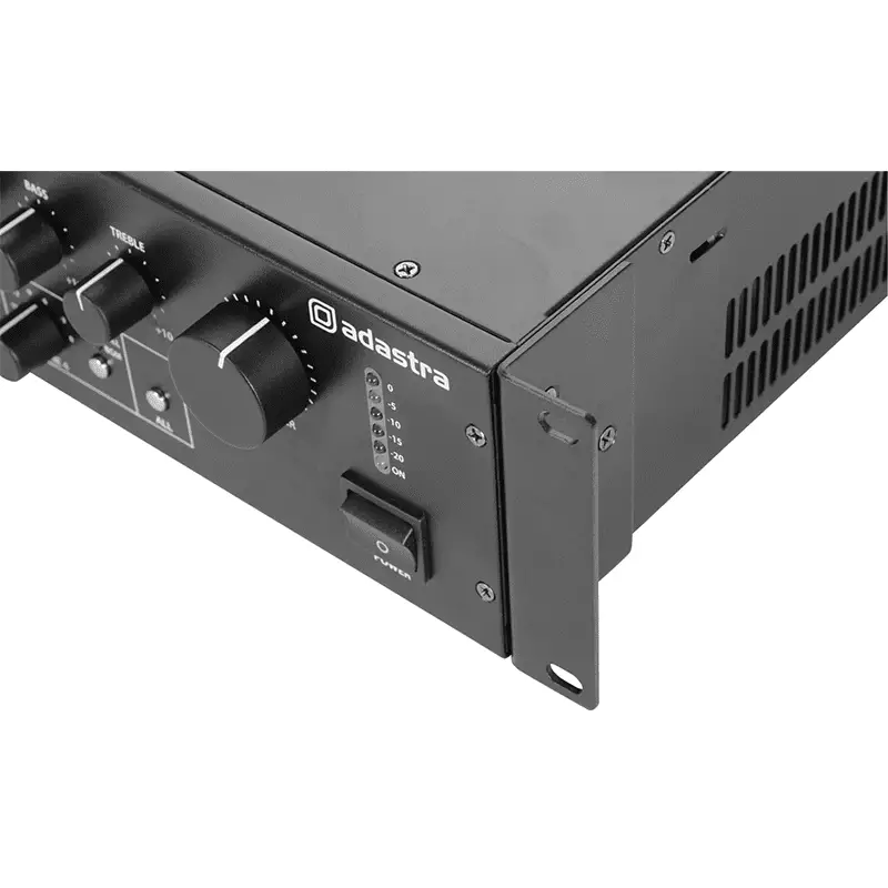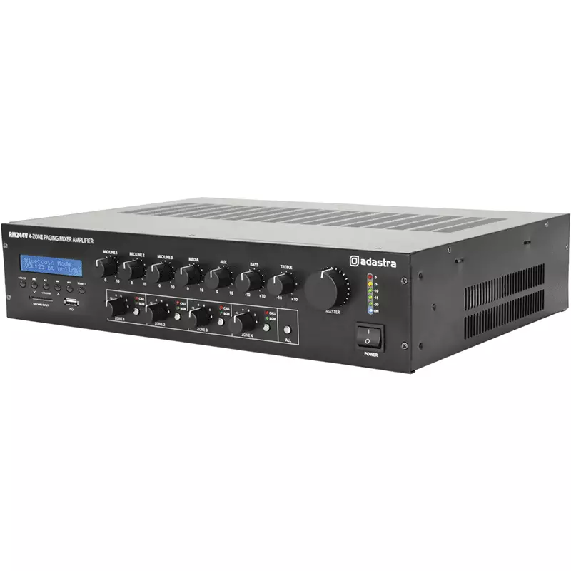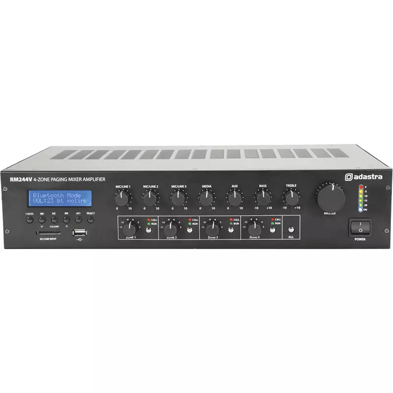 240W mixer-amplifier with 3 mic/line inputs, 1 aux input and a built-in media player. Connections for mic/line inputs are jack or XLR and channel 1 input has a variable mute for priority override. 24V contacts can be connected to a fire alarm panel for emergency evacuation if required. The media section can provide playback from Bluetooth, USB/SD media or an FM tuner. Output terminals are provided for 4 zones which share the output of the 240W amplifier, governed by 4 individual rotary volume switches on the front panel. RJ45 inputs on the rear panel allow connection for up to two CS4 call stations to enable paging to individual or all zones. The RM244V offers versatile 4-zone control without the expense of a quad amplifier and can even be operated as the front end to an expanded public address system.