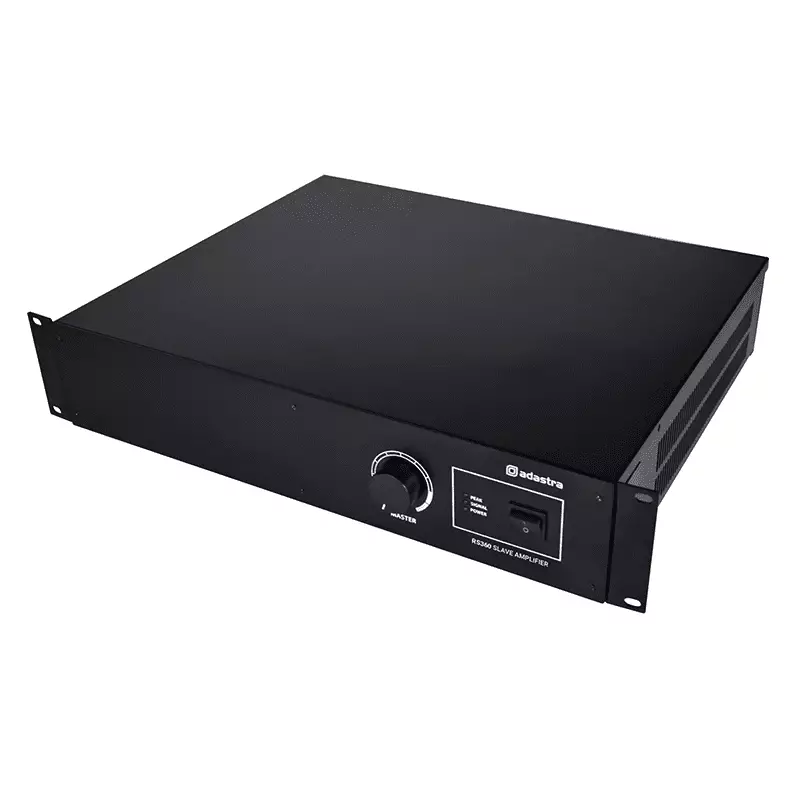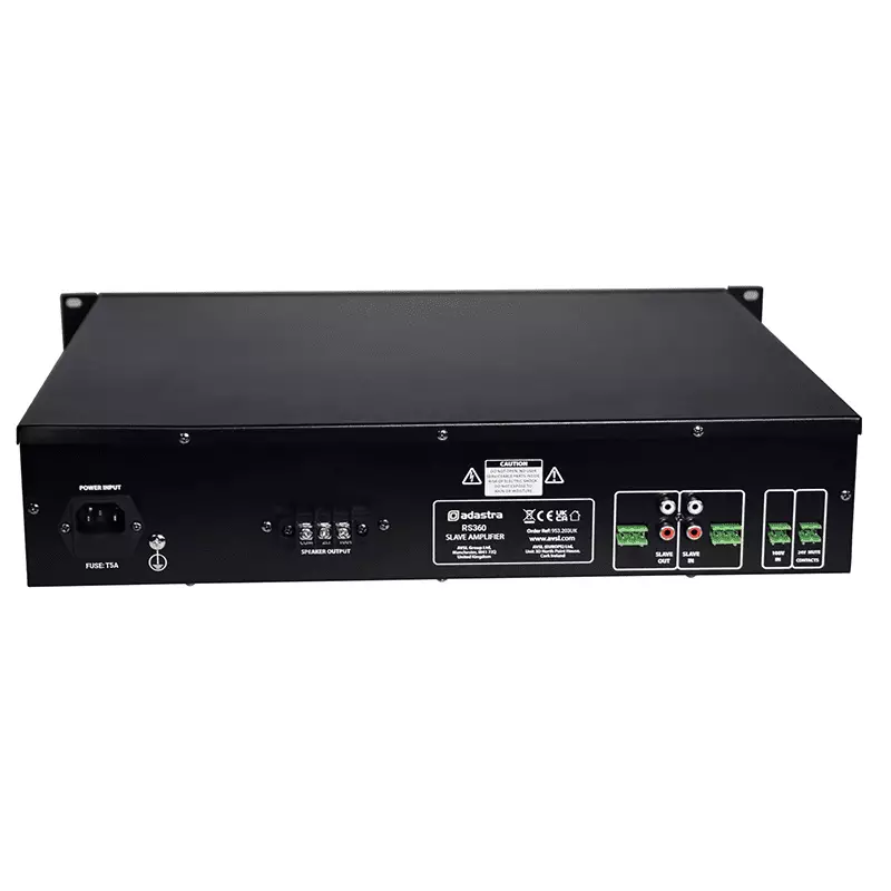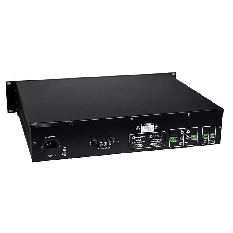 High power class-D 100V line slave amplifiers in a rack-mountable housing. Slave inputs accept standard line level audio from a mixer or RM series mixer amplifier. Slave outputs can be cascaded onto further RS slaves to build larger systems. All line level inputs are connectable via RCA sockets or hard-wired via removable screw terminals. A further removable screw terminal is provided for 100V input, which enables the RS series slave amplifier to extend an existing 100V installation by connecting directly to the 100V speaker feed, or indeed from a long distance 100V feed using standard double-insulated cable. A 24V terminal is provided for connection to a security or alert panel to mute the output if required during alarm triggering. Speaker outputs are either 100V or low impedance (switchable on RS121 and RS241) which is stable down to 2 Ohms, enabling multiple low impedance speakers to be connected if preferred. Designed to power medium to large installations from a mixer output or to expand existing systems.