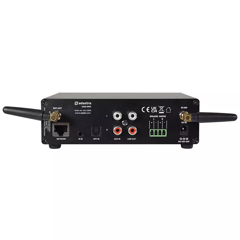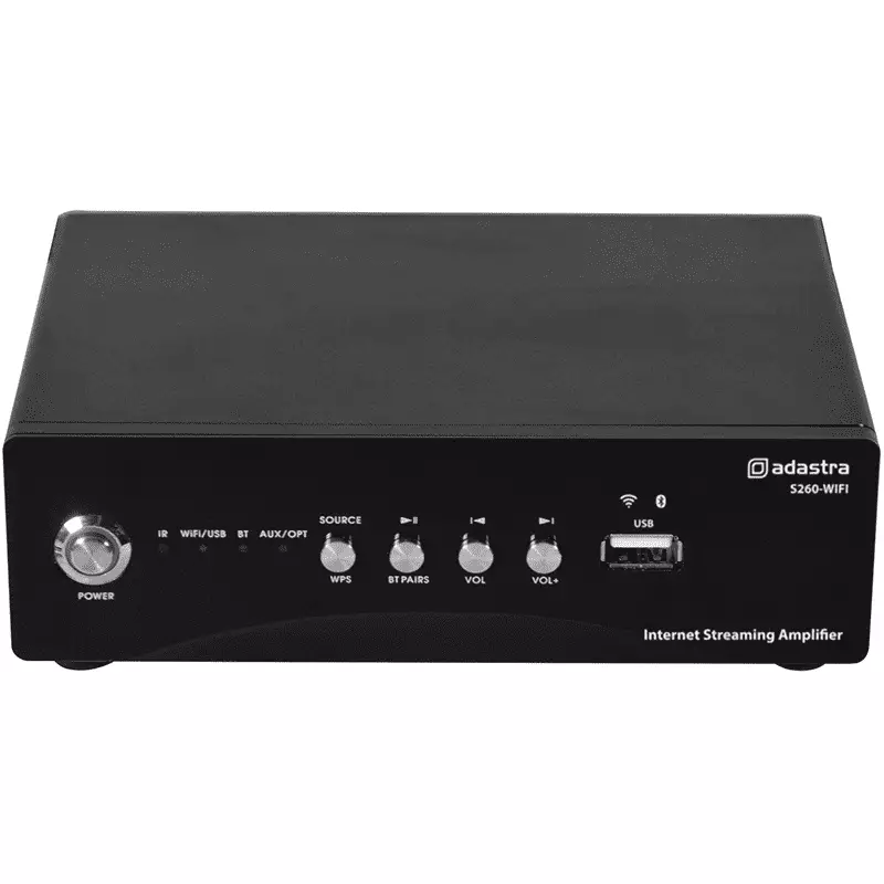 Class-D miniature amplifier delivering up to 2 x 60W output with Bluetooth and WiFi streaming capability. Controlled from an Android or iOS smart phone, the S260-WIFI is compatible with freely available apps to stream music and podcasts directly from a WiFi network. Embedded internet radio offers high quality digital audio from almost any online radio station or podcast available worldwide. Subscription services can store online playlists which can be cast directly from the internet without requiring the smart phone to be connected to the network. Wireless streaming of tracks and playlists stored on the smart phone can be sent from within the app or directly via Bluetooth to the amplifier. A line input is selectable for connection to a TV, CD, DVD or other playback device if required. In addition, the S260-WIFI has inputs for USB for playback of stored tracks. This neat unit provides a versatile “hands off” background music solution for continuous playback of music from internet services or a choice of other sources for bars, cafes, restaurants, reception areas and house parties.