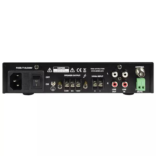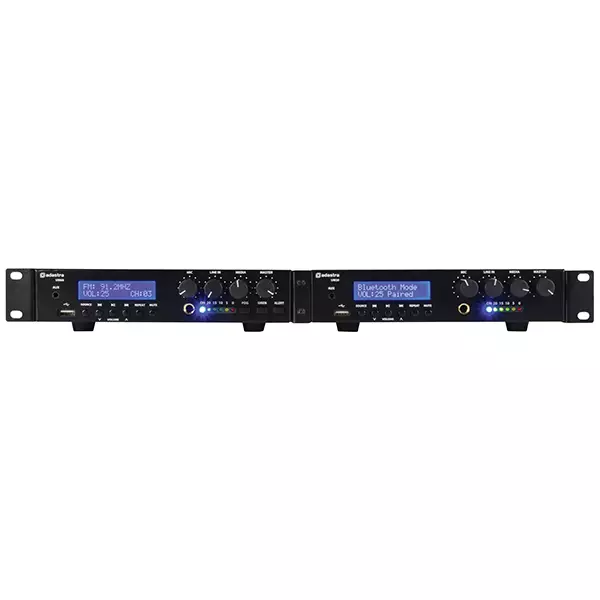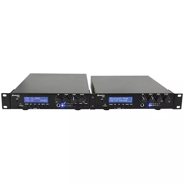 100V mixer-amplifiers with USB audio player, FM tuner and BT wireless receiver in an ultra compact housing. Microphone input, line input and USB/FM/BT sections are governed by front panel volume controls and a master volume. Mono output to either 100V line or 8 Ohms speaker load is connected via screw terminals on the rear panel. Supplied with hardware for mounting 2 units side by side in a 1U 19″ rack space. Designed as a versatile solution for small to medium PA installations.