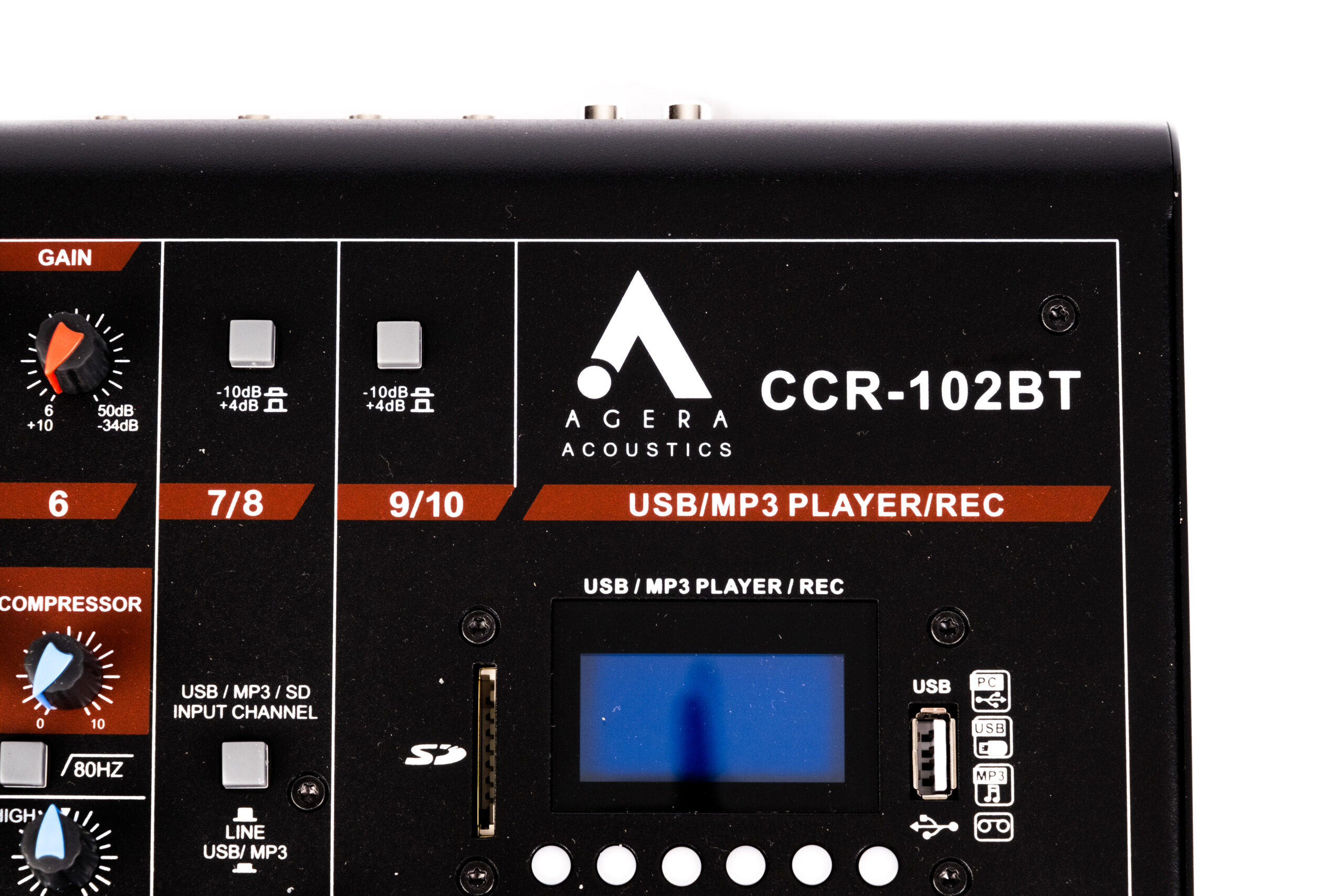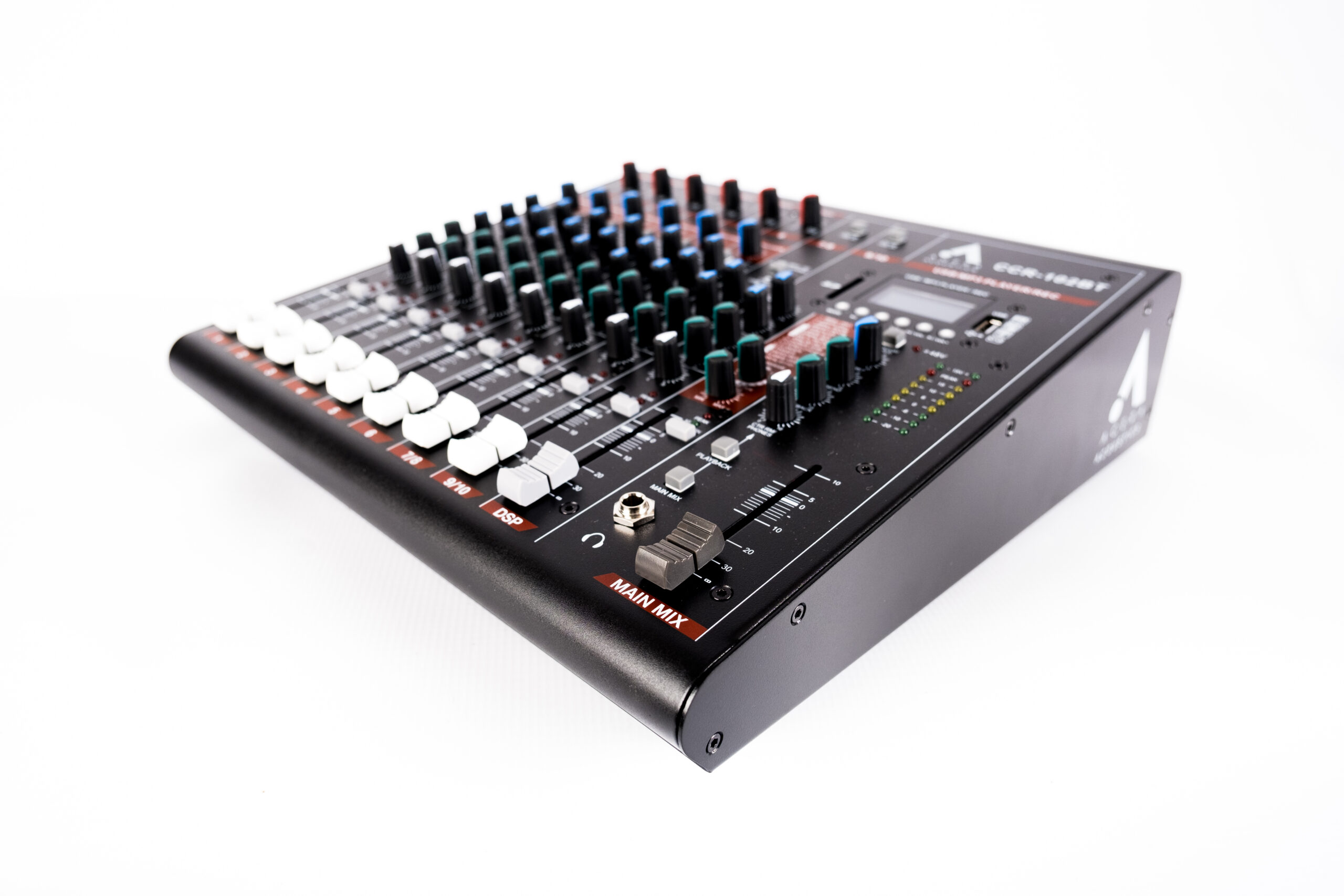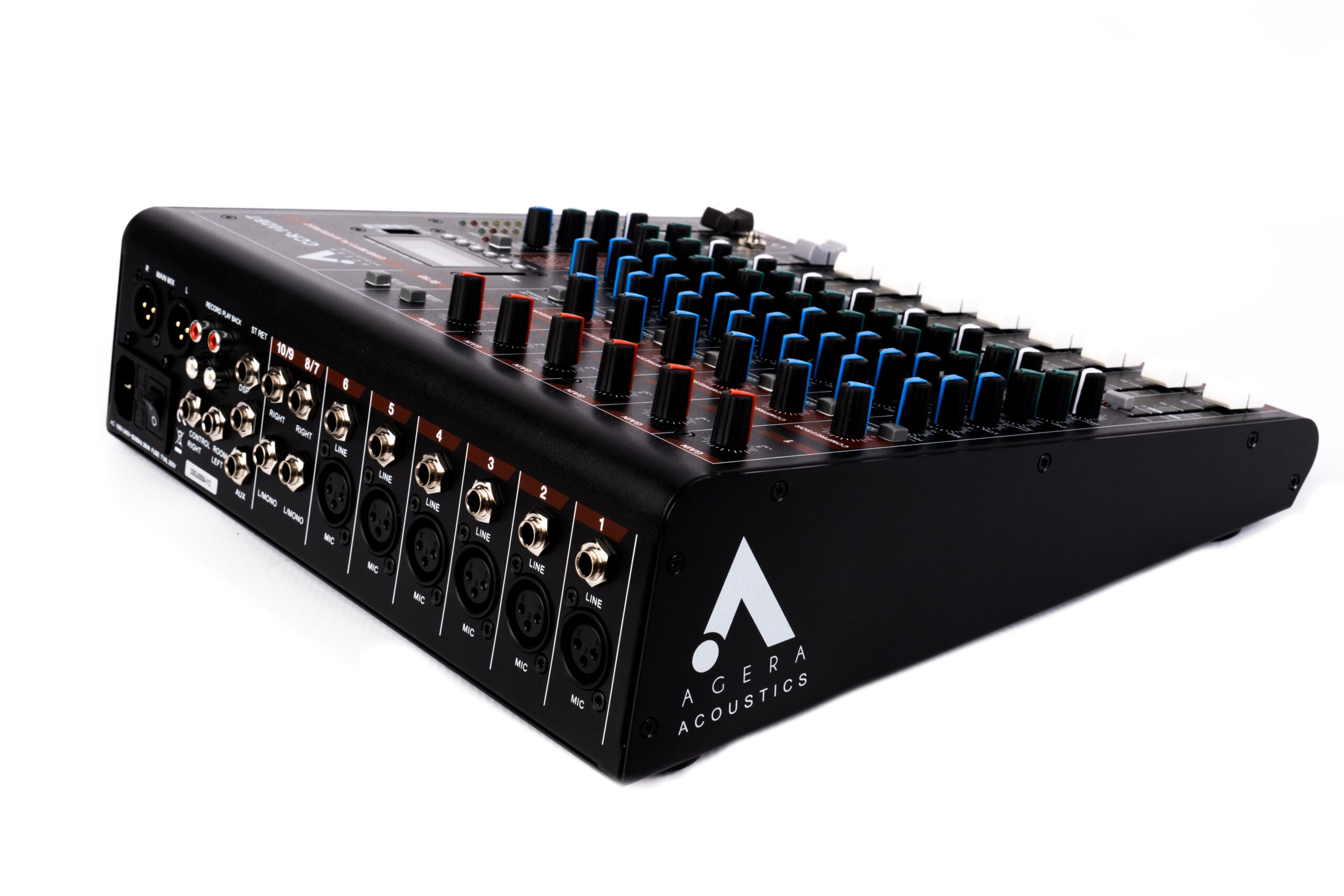 Agera Acoustics is proud to offer our range of analog mixing consoles which have been miticulously designed from the ground up, with you, the prosumer in mind. Our mantra of providing customers with the ultimate in quality performance for the cost, is extended throughout the range of consoles we have painstakingly engineered. All our consoles, from the smallest format, to our largest format, feature “A” grade, British pre-amps for the cleanest sound reproduction possible. Our “BT” series mixers include a media player incorporating bluetooth, USB, MP-3 playback, SD Card and recording functions, microphone and stereo line level inputs, as well as a built-in effects unit and compressors on each mic channel. This makes the “BT” series a clever, all-in-one solution for the gigging one man band, up to a full band requiring mutliple inputs and functionality. Our “U” series consoles have extended sweepable mids, 4 Aux channels, effects unit with 100 built-in effects and a built-in USB interface, while our flagship console, the CCR-2642 PRO includes all the above functions, plus separate phantom power on each mic channel, sweepable low and high mids on eq function, and 6 aux channels, as well as separate sub groups (4 sub groups) and main left and right output control. So, what are you waiting for. Come join our family. There’s an Agera Acoustics console waiting to help fulfil your musical destiny.