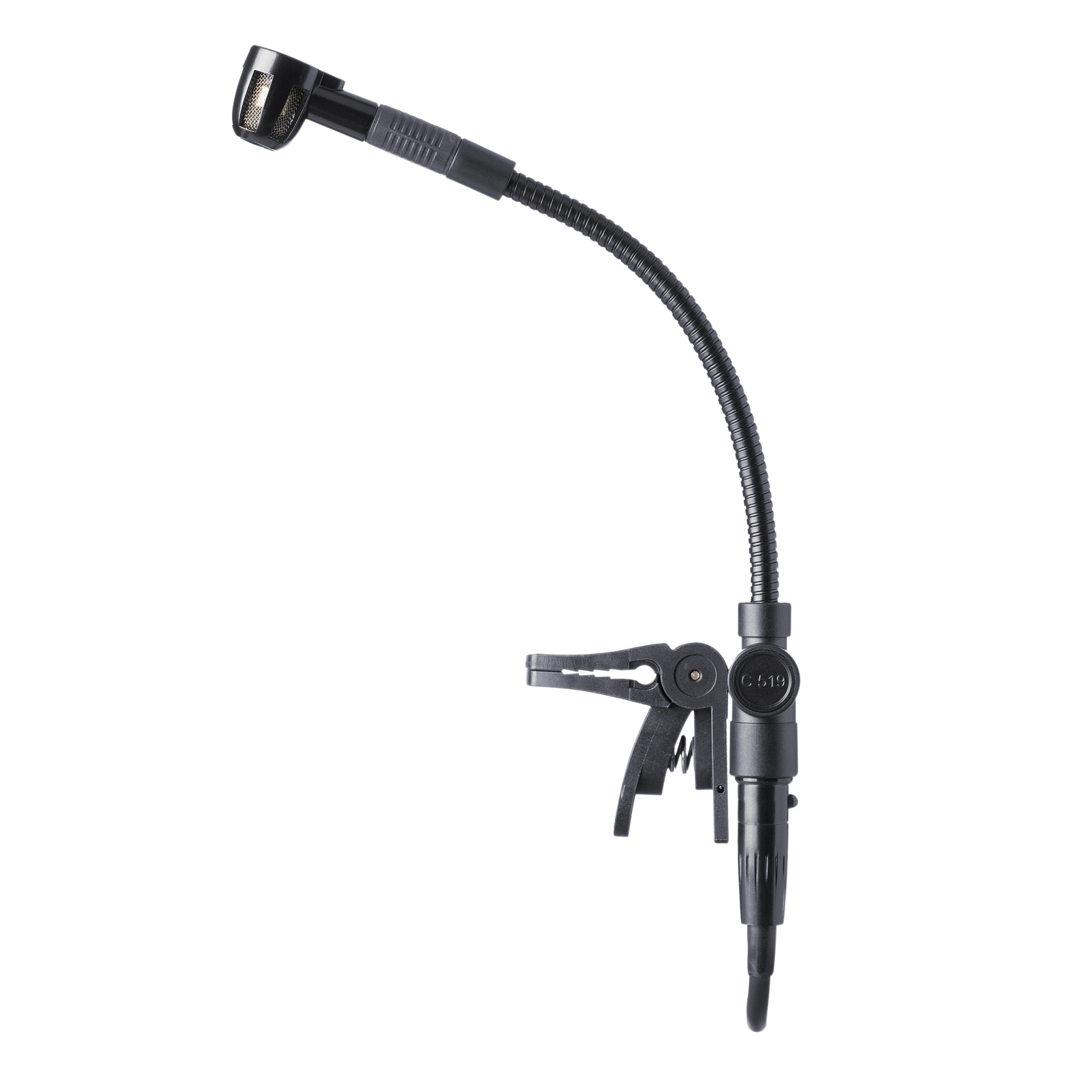 The C519 professional miniature condenser microphone clips gently onto the bell of a trumpet, saxophone, trombone, tuba, didgeridoo or any other wind instrument. Its tight cardioid polar pattern makes the C519 an ideal tool for use near monitor wedges, and its flat frequency response delivers a natural, powerful and clear sound. The MPAV from C519 M features an integrated, switchable bass cut for adjusting the microphone’s frequency response. The C519 ML package includes a mini-XLR cable and the unique A400 adapter plate for easy mounting onto wireless body-pack transmitters PT40/45/450/470.