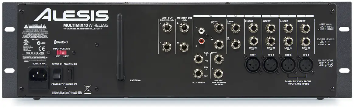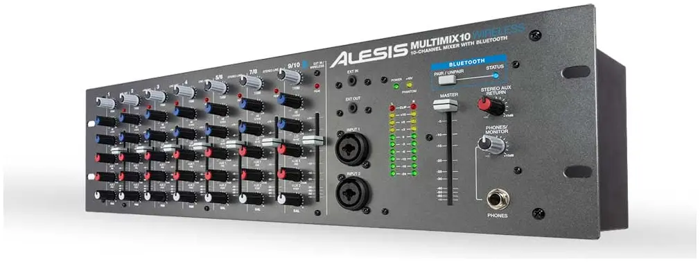 The Alesis MultiMix 10 Wireless is redefining the rackmount mixer category. Compact and complete, the MultiMix 10 Wireless delivers ten-channel mixing in a neat 3U package that is perfect for smaller clubs and venues, houses of worship, as well as mobile/traveling systems. The MultiMix 10 Wireless benefits from an array of easily accessible front panel jacks that enhance the versatility and usefulness of this generously equipped mixer. Topping off the feature list is a channel dedicated to receiving the stereo playback from any Bluetooth device. The MultiMix 10 Wireless is a new breed of rackmount mixer.