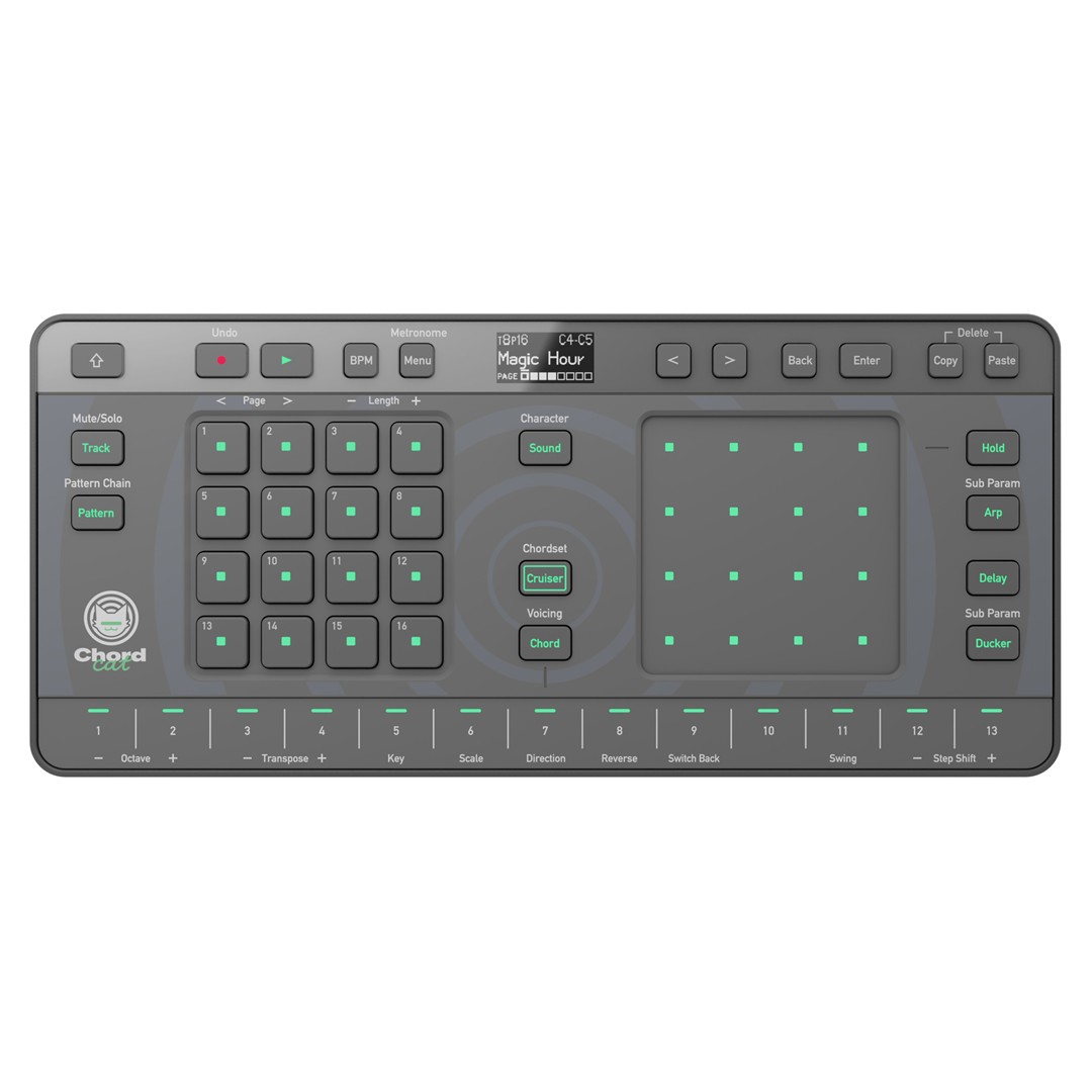 You can assign chords to the keyboard while the system automatically provides the next suggestion, keeping creativity flowing without interruption. CHORDCAT enhances track-building with 8 tracks, 16 patterns, and 128 steps, enabling detailed arrangements and precise timing. Each track provides independent control of instruments such as drums, bass, and synths, offering complete flexibility. The Pattern Chain feature ensures smooth transitions, supporting both studio sessions and live performance versatility.