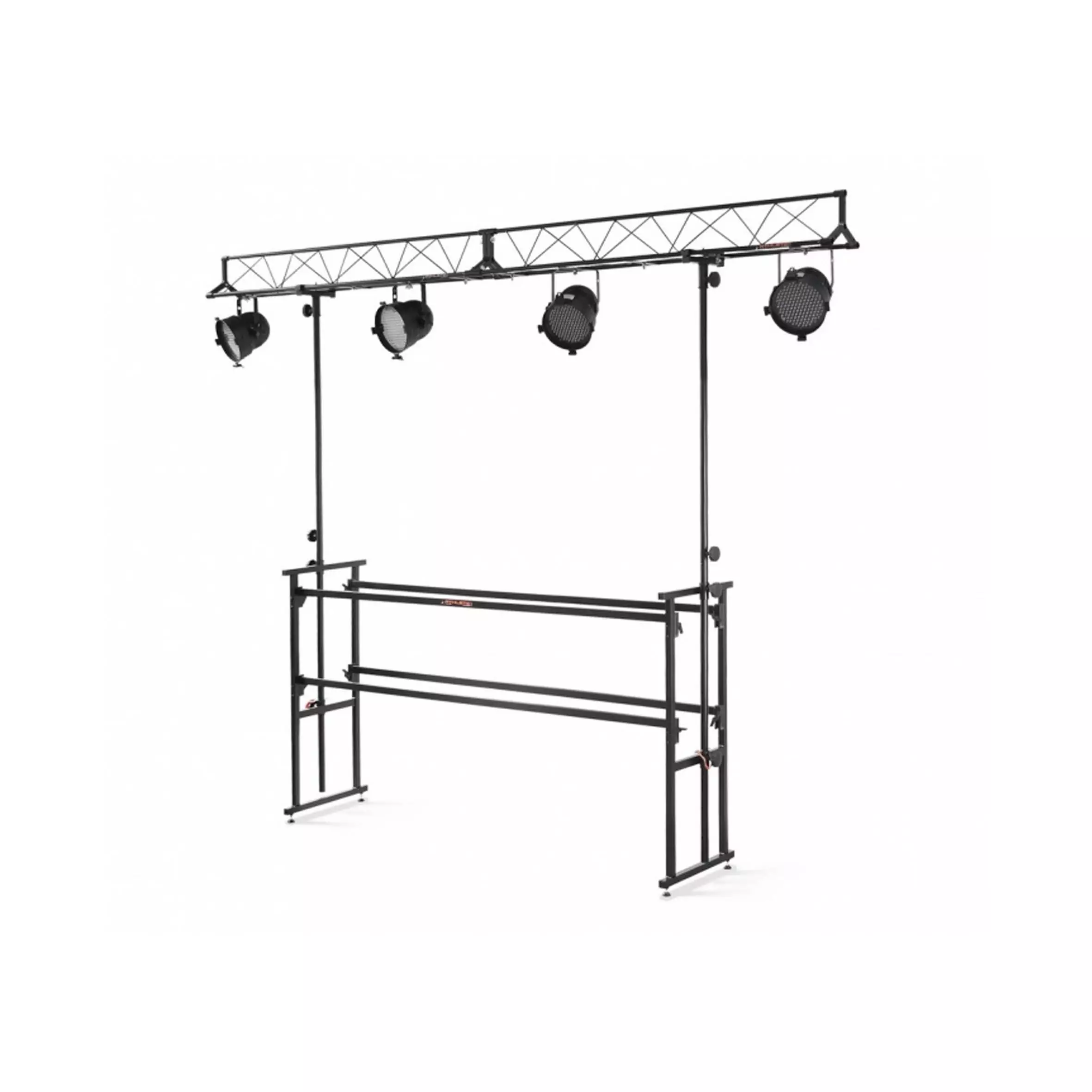 Universal stand for the mobile DJ, additionally equipped with 2 three-armed trusses with a total width of 300cm, which allows placing all the playback equipment and lighting on one stand. Thanks to its simple structure, it is easy to fold, easy to transport.