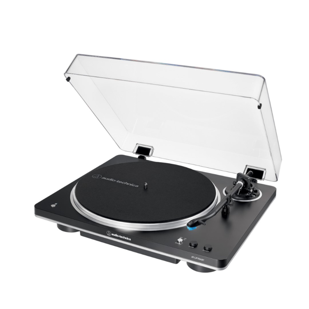 The Audio-Technica AT-LP70XBTBS Fully Automatic Wireless Belt-Drive Turntable serves as an excellent entry-level option for audiophiles interested in vinyl. This sleek turntable combines the warmth of analog sound with Bluetooth® convenience. Effortlessly connect to Bluetooth-enabled speakers, headphones, and other devices. It supports Qualcomm® aptX™ Adaptive audio codec for superior playback quality. The AT-LP70XBT plays both 33-1/3 and 45 RPM records, adding versatility to your vinyl collection. Its built-in switchable phono preamp allows direct connection to home stereo systems, powered speakers, or other components, eliminating the need for a dedicated phono input.