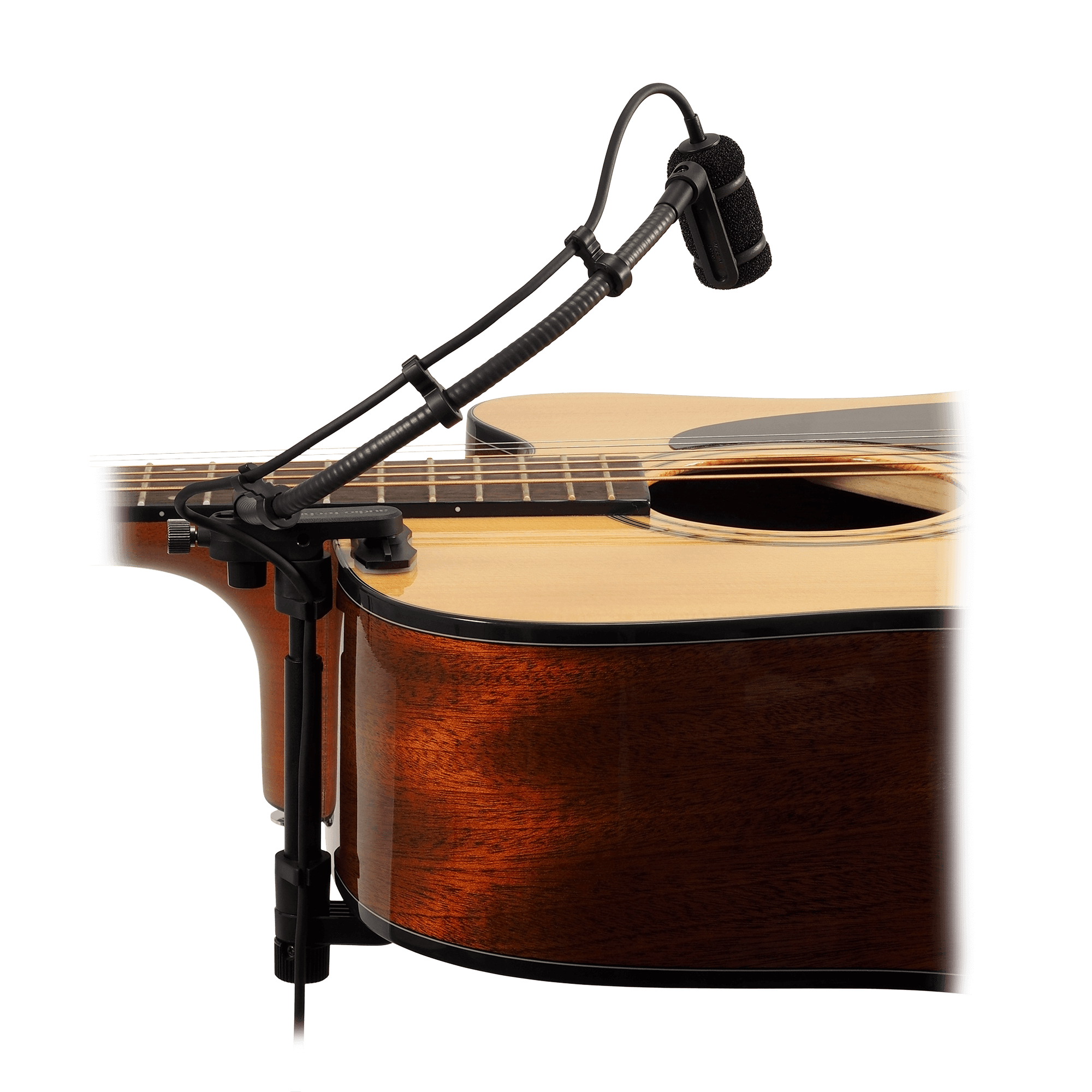 The Audio-Technica ATM350GL is a premium cardioid condenser instrument microphone designed specifically for guitar applications. Featuring a long, integral clamp, it attaches securely to the body of a guitar or other stringed instruments without causing damage. Its cardioid polar pattern isolates the guitar’s natural tone while minimizing pickup of surrounding instruments and stage noise, delivering a clear, focused sound that works equally well for live performance and studio recording.