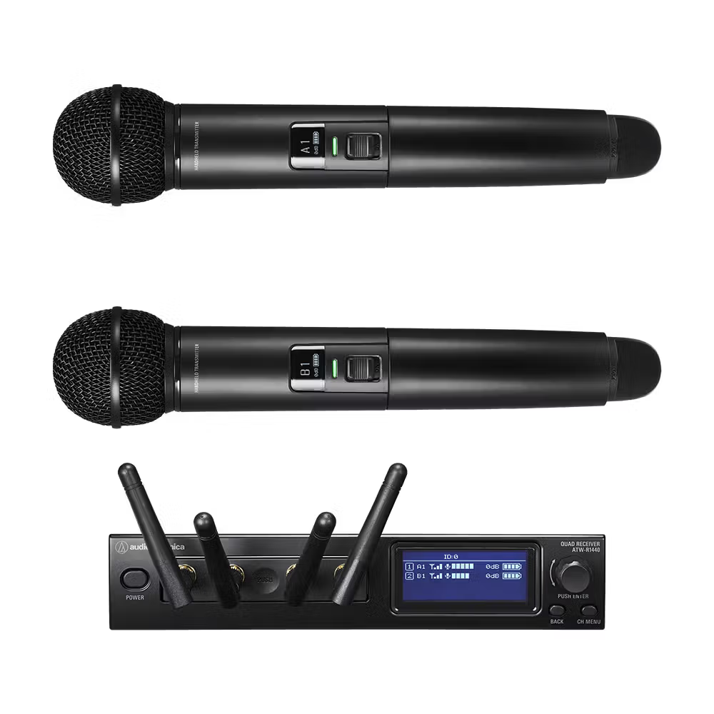 System 20 Digital Wireless System includes ATW-R1440 4-channel receiver and two ATW-T1402 handheld microphone transmitters.