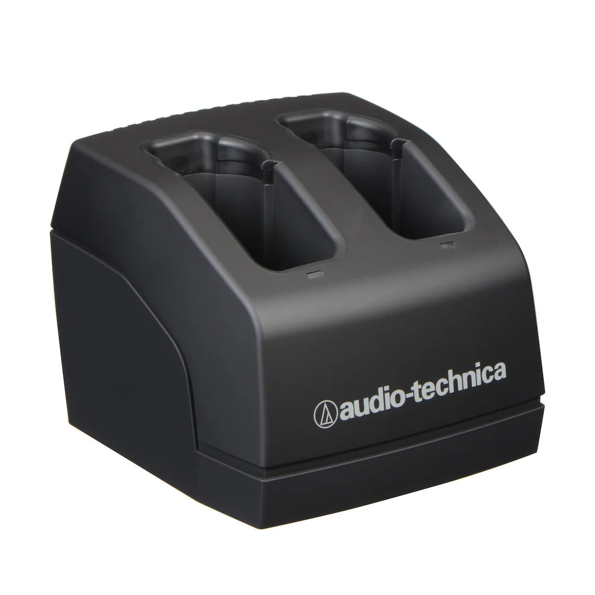 This two-bay recharging station provides power to recharge NiMH batteries in two ATW-T220c handheld transmitters and/or ATW-T210c UniPak® transmitters in any combination. Maintenance charging prevents battery self-discharge until the transmitter is removed from charger. The charger draws power from a standard wall outlet.