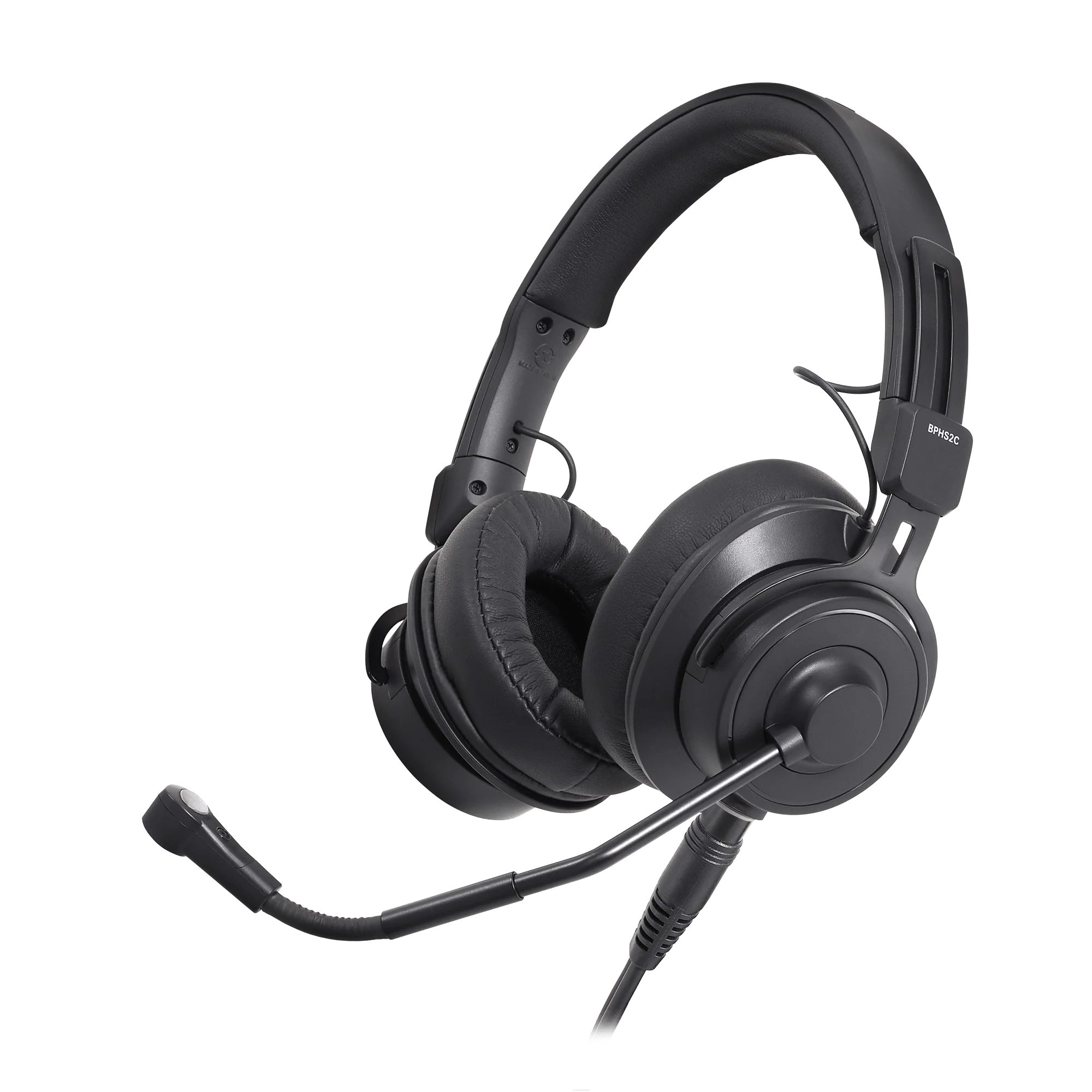 - Boom-mounted microphone can be positioned on the left or right side