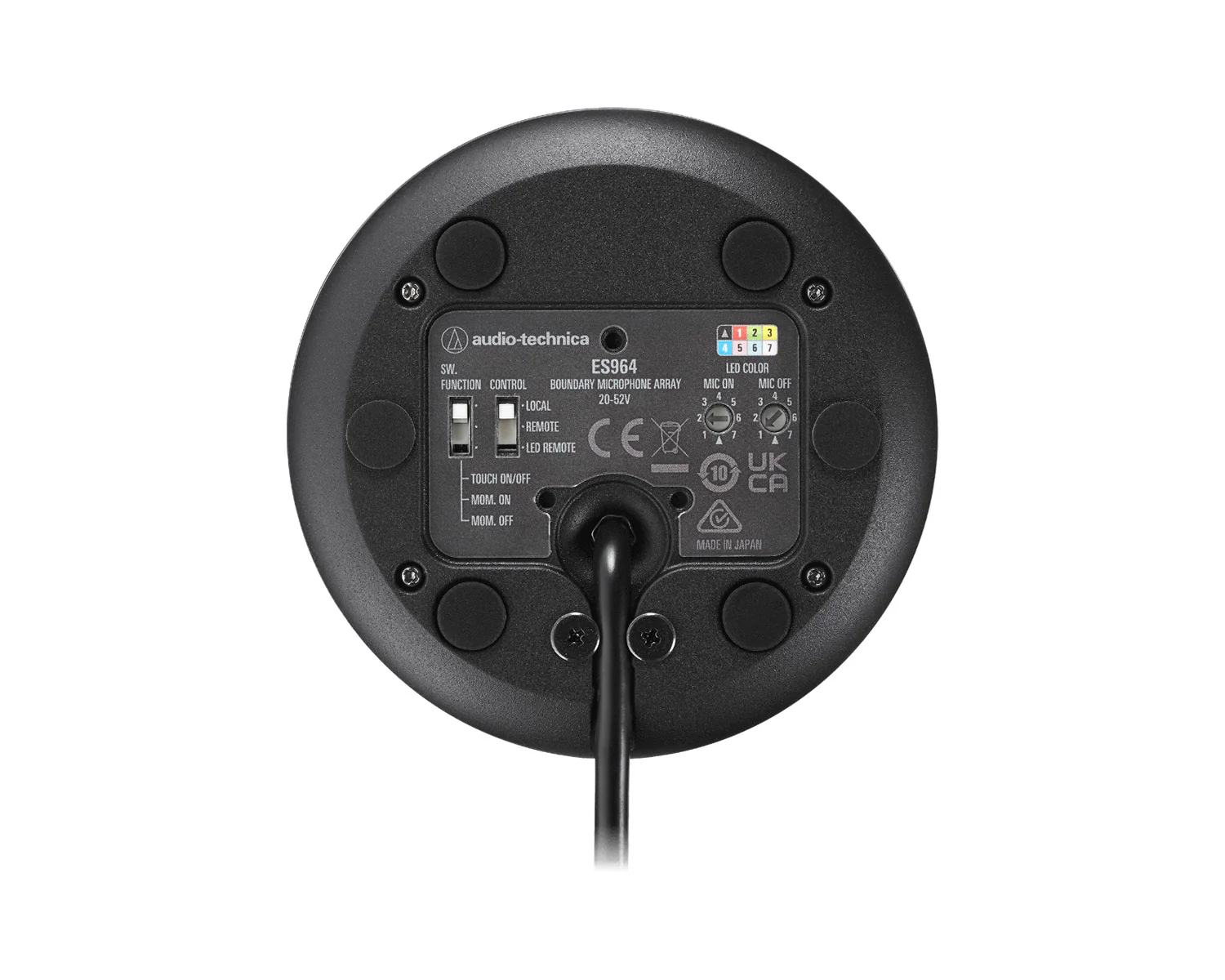 The ES964 is a compact boundary microphone array that is simple to install and provides clear audio for multi-person conference environments. This microphone is designed for small-group online conferences, and for businesses that are considering installation or expansion of shared or permanent conference spaces. With its low-profile design, the microphone takes up minimal space on a tabletop, but still captures clear, natural sound for online calls.