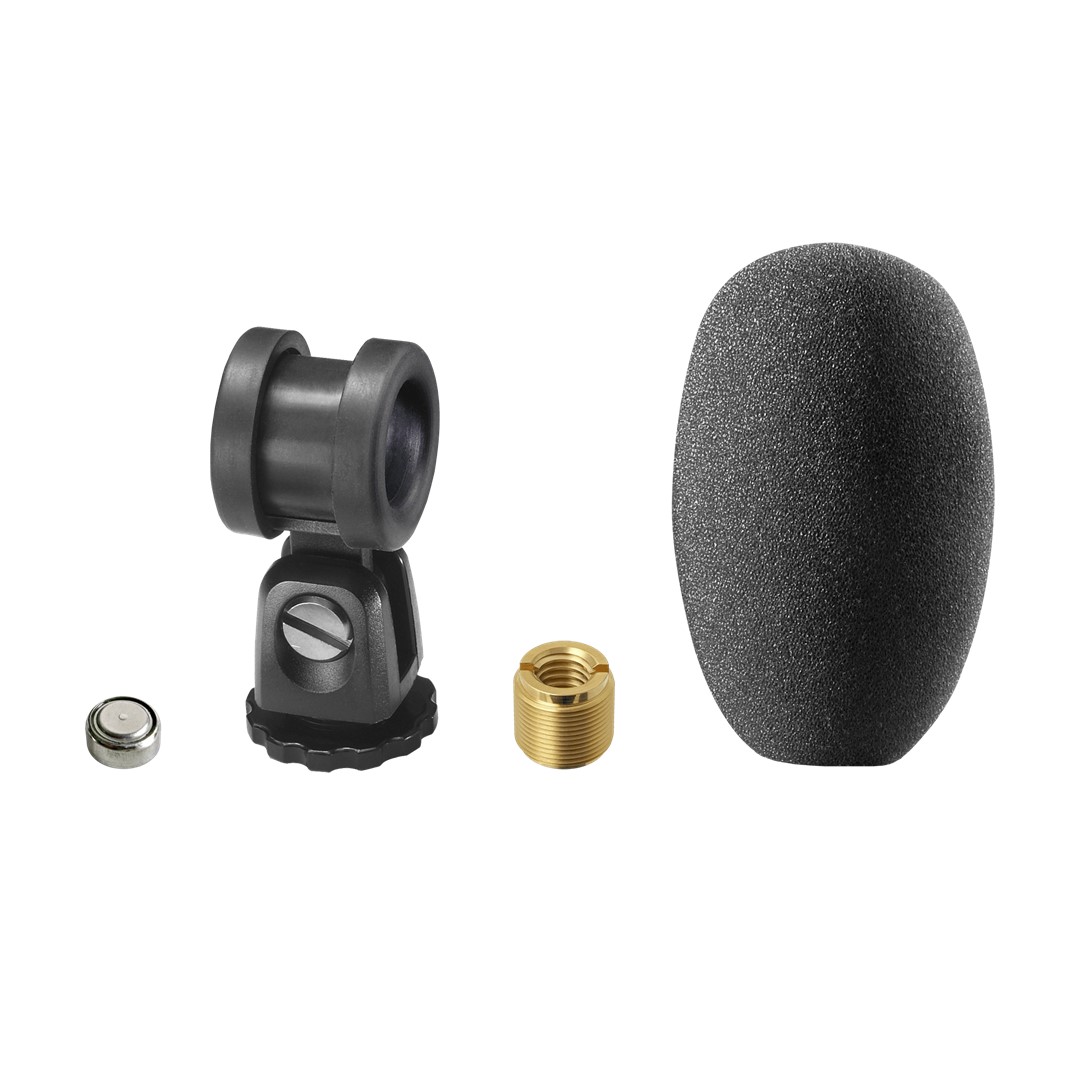 The microphone includes an accessory shoe and a permanently attached coiled cable. The coiled cable extends from 6 to 12 inches, allowing flexible microphone positioning during recording sessions. A windscreen and windjammer reduce wind noise and plosives, ensuring clear audio capture.