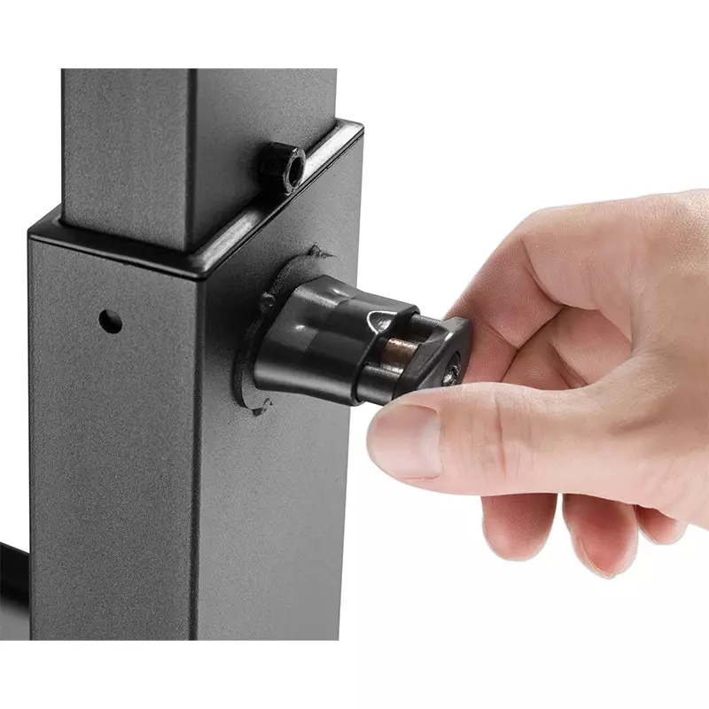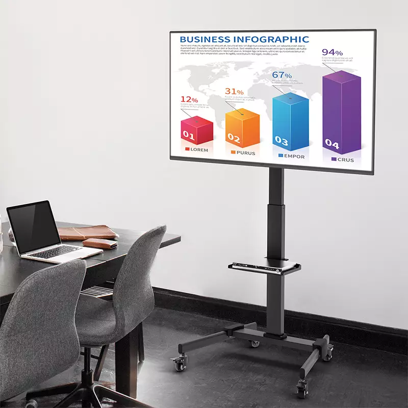 A compact, mobile TV trolley with quick-release height adjustable fixing bracket to support most screens from 32″-55″. The toolless tiltable VESA plate can be adjusted up and down 10° to position the screen for optimal viewing experience. Four lockable safety casters make the trolley easy to move and protect the floor from scratches and scuffs while moving or stopping. A height adjustable equipment shelf provides extra storage for small devices and an integrated cable management system helps to create a clean appearance.