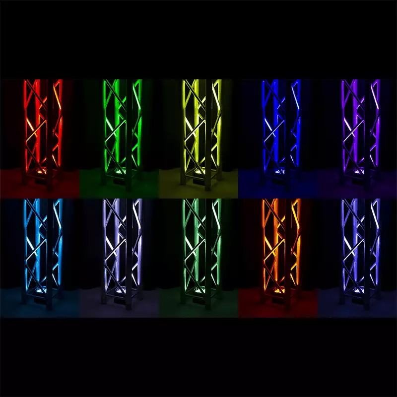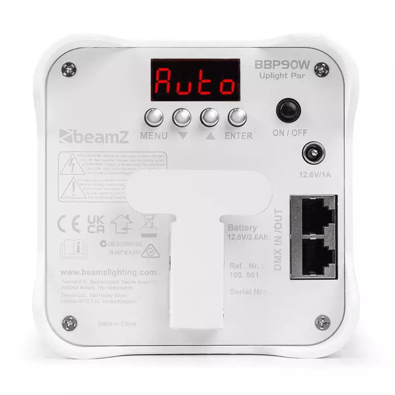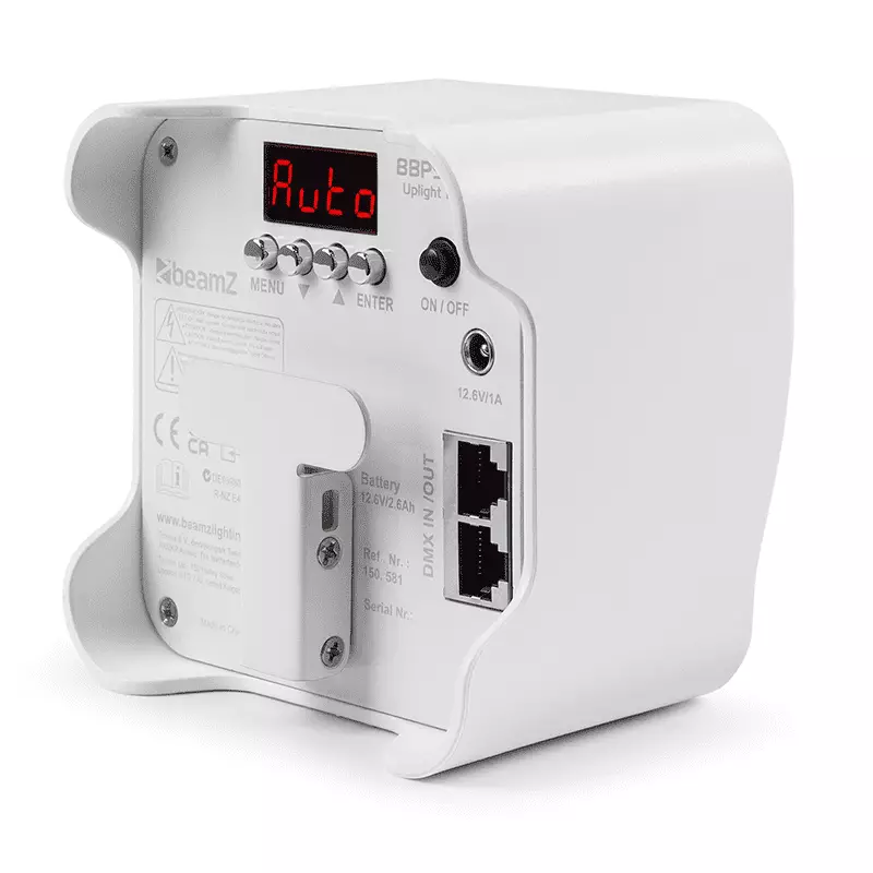The BBP90 battery powered LED uplight is perfect for truss wash and other feature effects where access to power is limited. It’s equipped with 4x 4W high efficiency RGB-UV LEDs to create bright, intense and saturated colours and can be controlled through DMX, remote control or manual mode selection. Each charge lasts up to 20 hours (1 colour) from a single charge. The adjustable foot can be fixed in different angles for angular placement of the fixture. Extreme silent, no fan!
