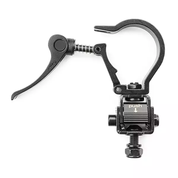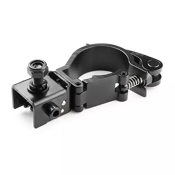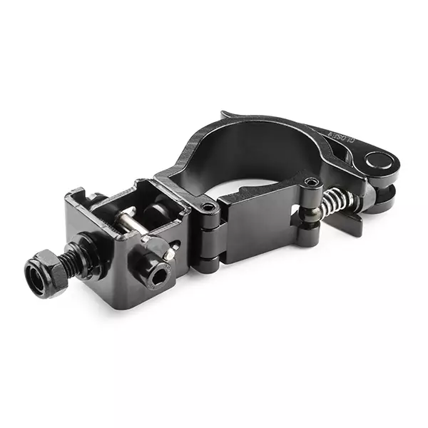 Universal compact aluminium slimline half coupler for pipe and truss mounting fixtures. For easy tilting of the mounting system to transport the light effect in a flight case. High-strength aluminum construction.