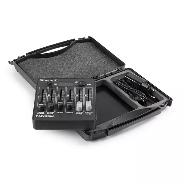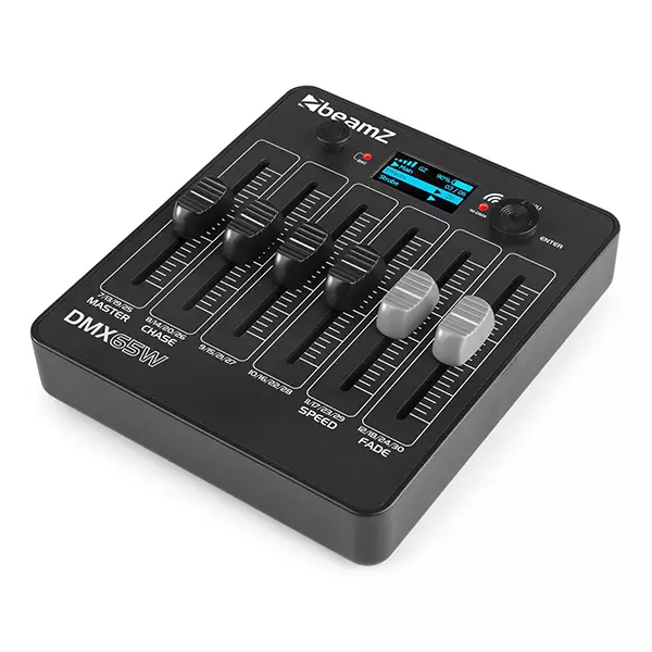 The DMX65W mini DMX controller is a compact light-control-unit, specially designed for use with for example wireless BeamZ Uplighters. You can wirelessly synchronize an unlimited number of W-DMX fixtures simultaneously, and operate them using the simple navigation on the OLED digital display. The DMX65W controller with rechargeable battery can be used as a portable, handheld device or wall mounted for permanent installation. Supplied in robust plastic carrying case.