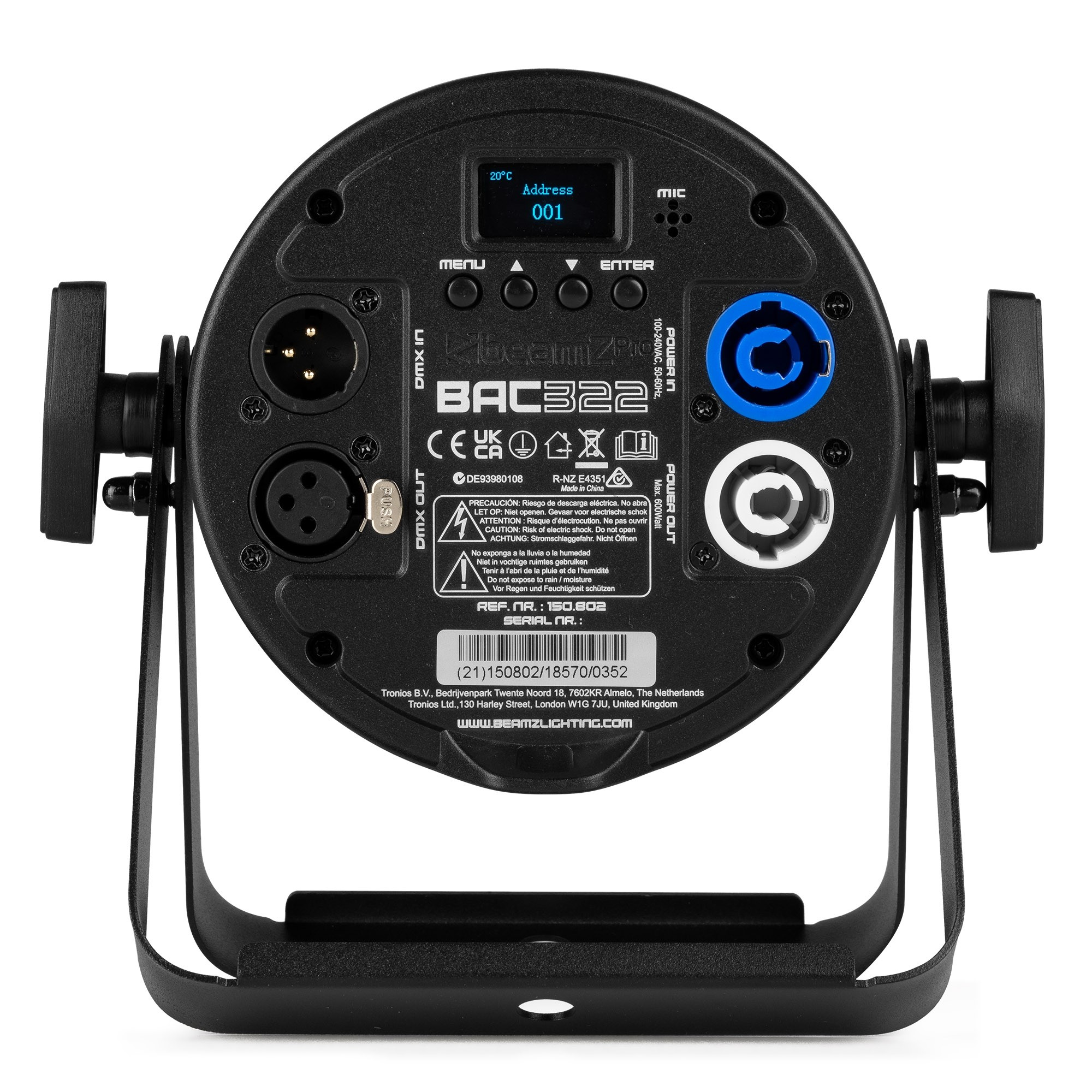 The beamZ BAC3 series is series of compact aluminium LED ProPars, developed according to the latest LED technology. The combination of high-power LEDs built into an attractive cast aluminium housing ensures highly efficient heat dissipation. This eliminates the need for an internal fan, making this Par absolutely silent in operation. The OLED display with 4 button LED menu allows for easy access to the functions including DMX, master/slave, sound activation and the stand alone function. Equipped with P-Con in/out and XLR 3-pin in/out connectors for daisy chaining multiple units together. Magnet in front for optional accessories: Filter 40° (150.812), Barndoor (150.813)