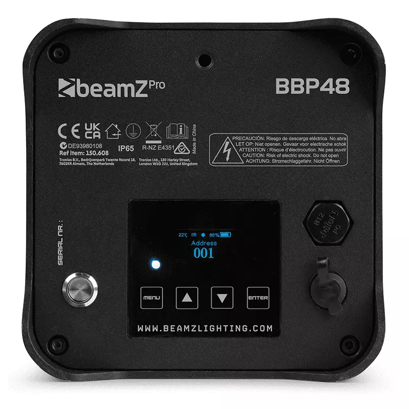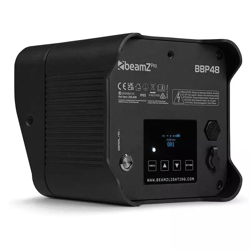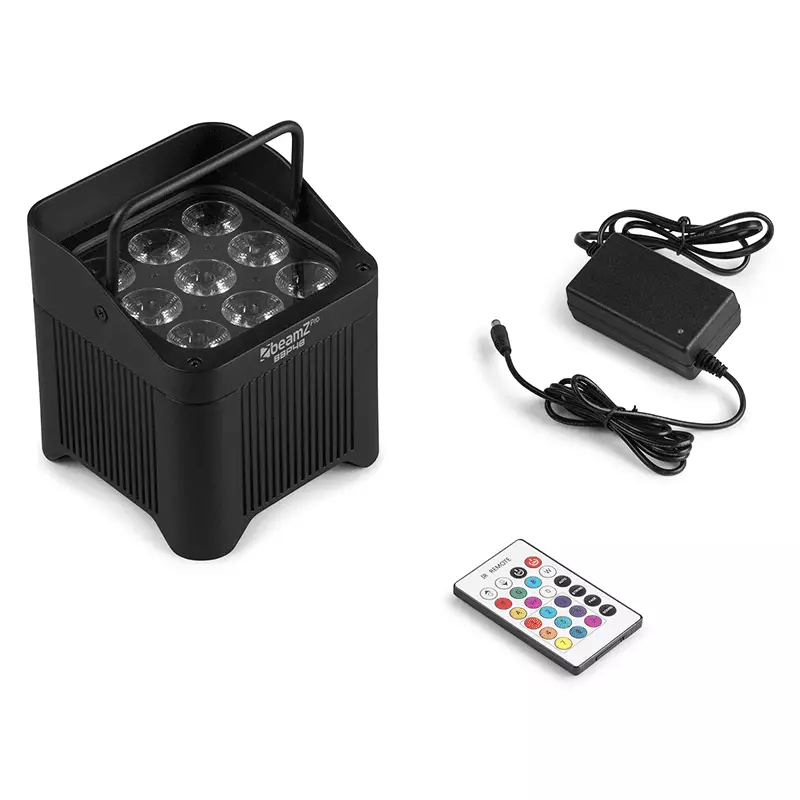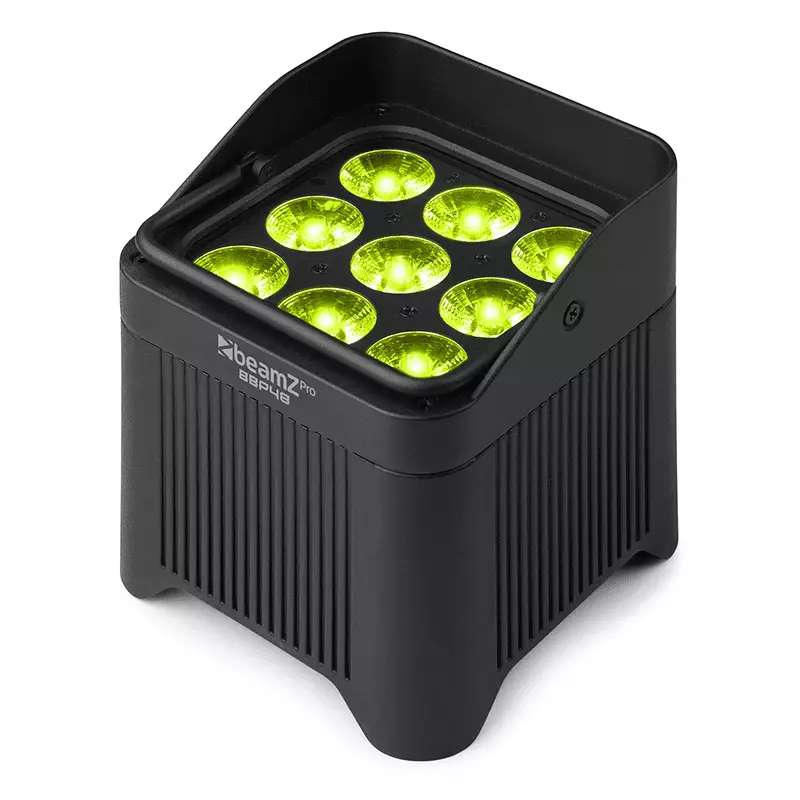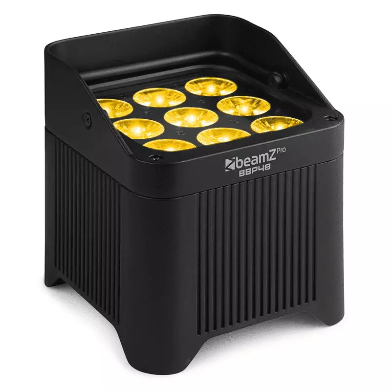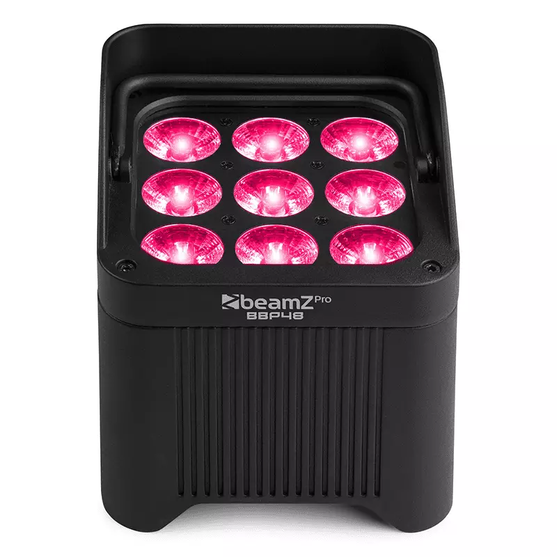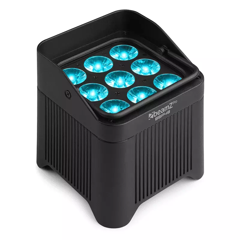 The BBP48 is a compact Battery Par ideal for use as accent and uplighting. The BBP48 is IP65 rated and hence for outdoor and indoor use. It’s equipped with 9x super bright 12W RGBAW-UV LEDs and comes fitted with a fixed built-in battery which will last up to 18 hours when fully charged, depending on colours and intensity. The adjustable foot can be fixed in different angles for angular placement of the par. The BBP48 can communicate in a variety of ways, with DMX and wireless DMX. This makes the units easy to connect to each other.