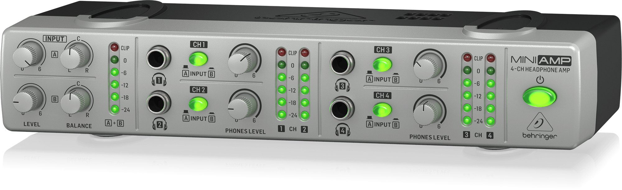 - 2 balanced stereo main inputs with independent Level and Balance controls for individual mixes, selectable for all 4 headphone amplifiers