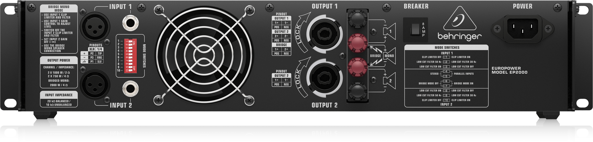 - 2 x 1,000 Watts into 2 Ohms; 2 x 750 Watts into 4 Ohms; 2,000 Watts into 4 Ohms (bridge mode)