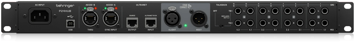 - Compatible with Behringer P24 personal mixers, AES50, Ultranet and Analog Connectivity