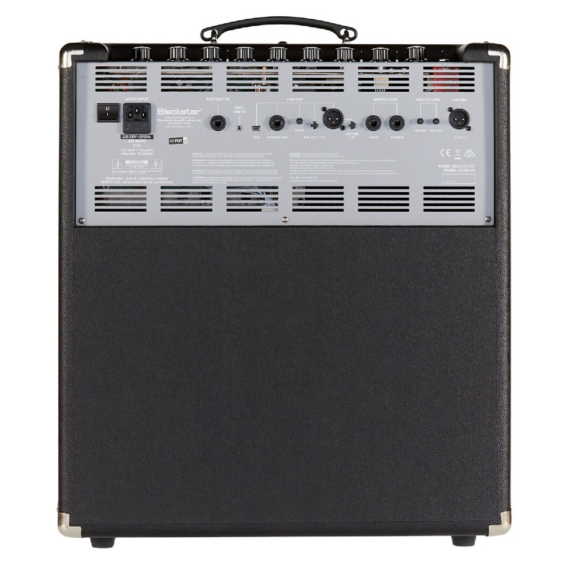 250-watt, 1×15″ Bass Combo with 3 Voicings, Overdrive, 3-band EQ, Compression, Chorus and Sub-octave Effects, USB, and MP3/Line In