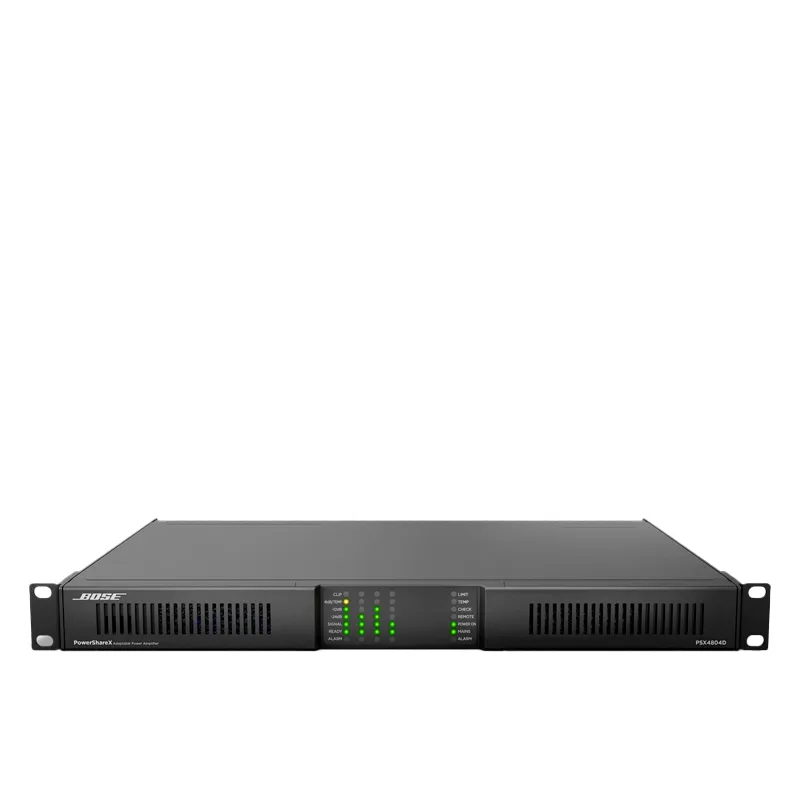 The PowerShareX PSX4804D is the most powerful model in the PowerShareX line — a 4-channel, 4,800-watt adaptable amplifier built for the largest and most demanding commercial sound installations. Leveraging the next generation of Bose PowerShare technology, the PSX4804D allows the full 4,800 W to be distributed dynamically across all four channels, providing unmatched flexibility in system design.