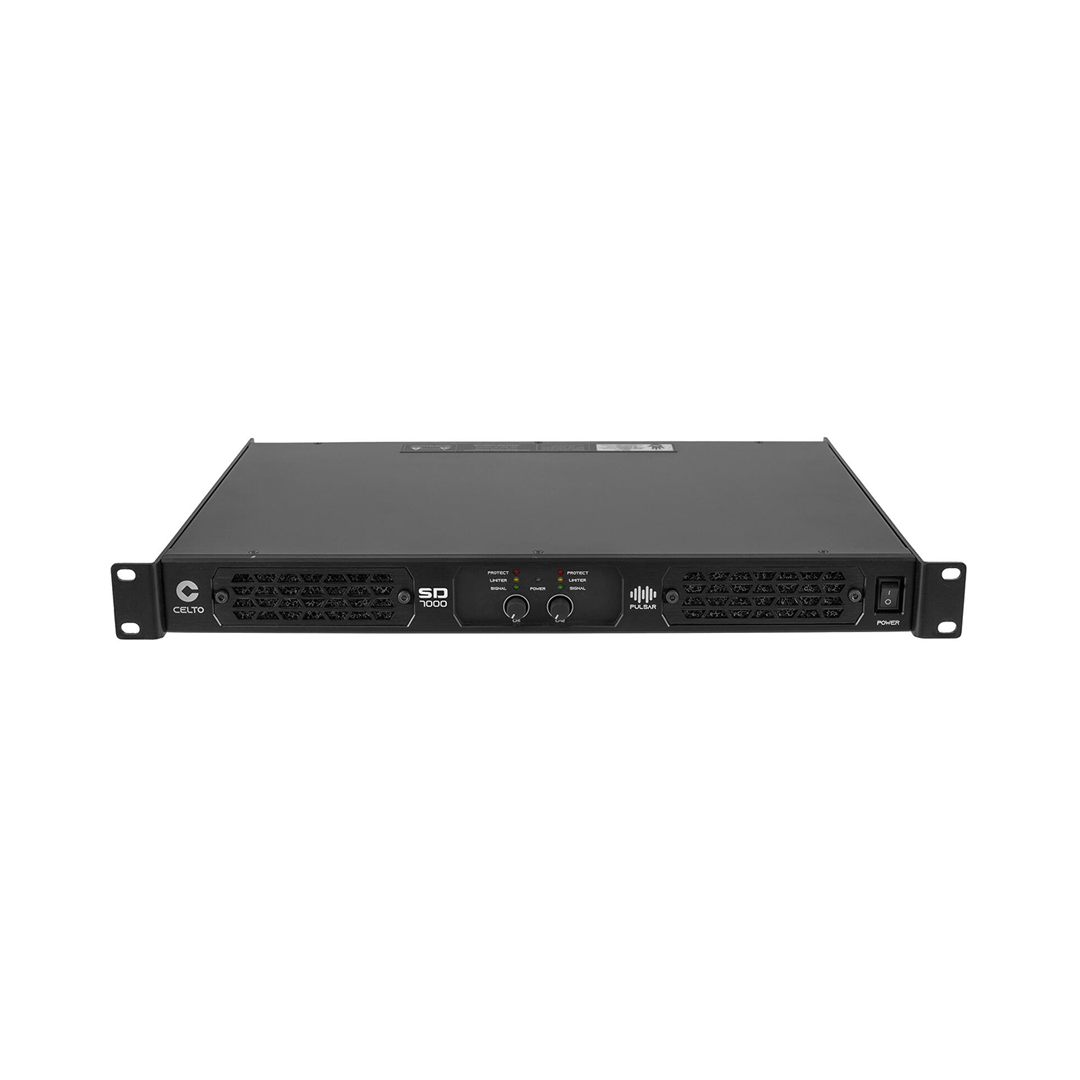 The Celto Acoustique SD7000 is a high-power, lightweight stereo amplifier built for touring, installations, and professional live sound. It uses a high-efficiency SMPS (switch-mode power supply) with Active PFC and a Class D output stage to deliver strong power performance in a compact 1U 19″ format.