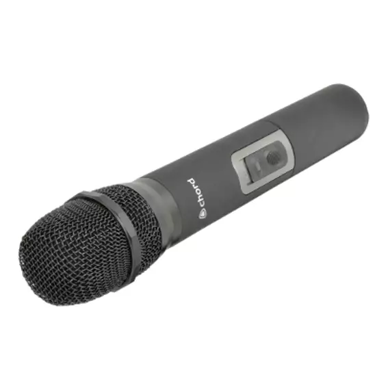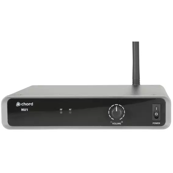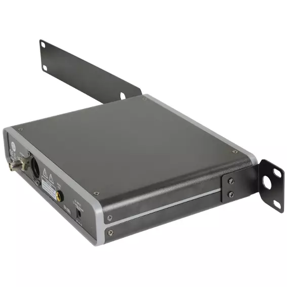 Wireless microphone system with fixed UHF handheld transmitter and half rack-width receiver. The receiver unit is compatible with standard 19″ racks using the included rack ears and front mounting antenna accessories.