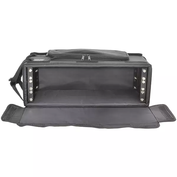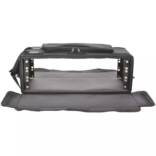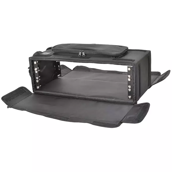 19″ rack case in a padded bag with front and rear flaps for access and ventilation. Equipment is protected by an inner wooden frame and secured by metal rack strip front and rear. Also fitted with carrying handle, shoulder strap and zipped outer pocket.
