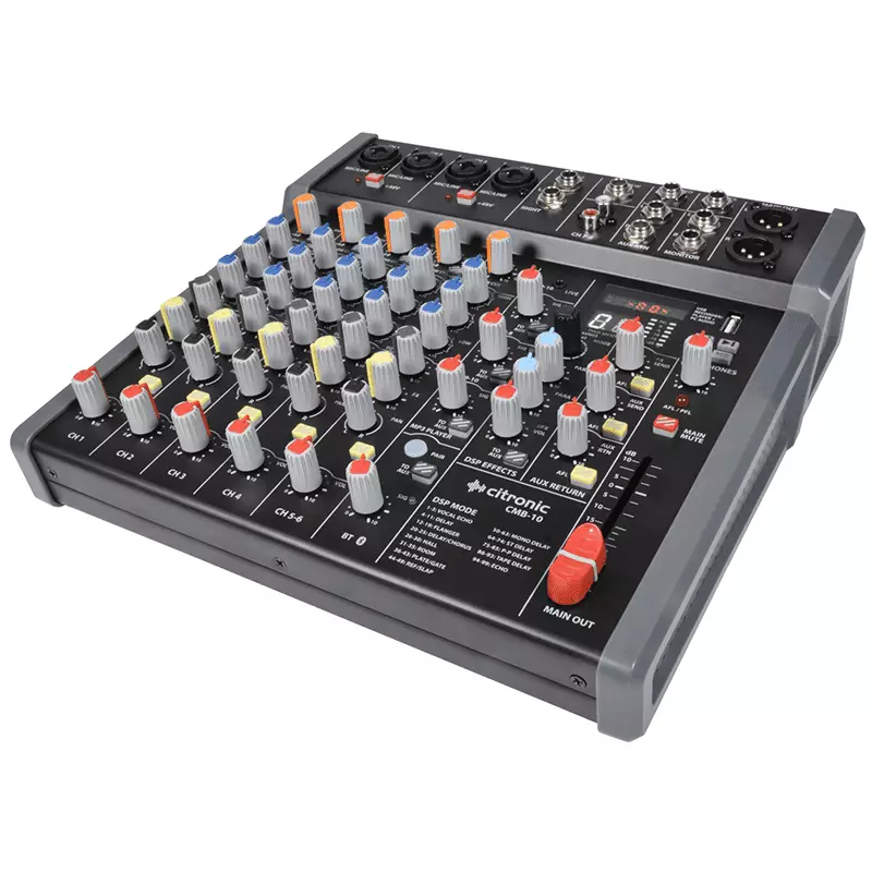 Fully featured audio mixer with 4 mono input channels, a stereo line input, stereo Aux input and a further minijack stereo input. Each mono mic/line channel has a combo XLR/jack input with +48V phantom power switchable in pairs for the XLR inputs. Each mic/line channel has a Gain control for matching the input source and a low-cut switch to filter out rumble or handling noise from microphones. Each mono channel also has High/Mid/Low EQ controls, Aux out level, FX level and Pan control. The onboard foot-switchable DSP effects engine has 99 presets for delay, reverb and modulation effects, each of which can be adjusted using two parameter controls. An onboard Bluetooth receiver has an illuminated pairing button and independent volume control. The USB type-A port on the top panel is for playback of audio files or can be used to record the main outputs to a USB storage device or as an external audio device when connected to a laptop. Main output is served by left & right XLR, in addition to 6.3mm monitor and headphone outputs and the Aux send & stereo return loop. The CMB-series offers large console features in a more manageable format for live performers and project studio recordists.