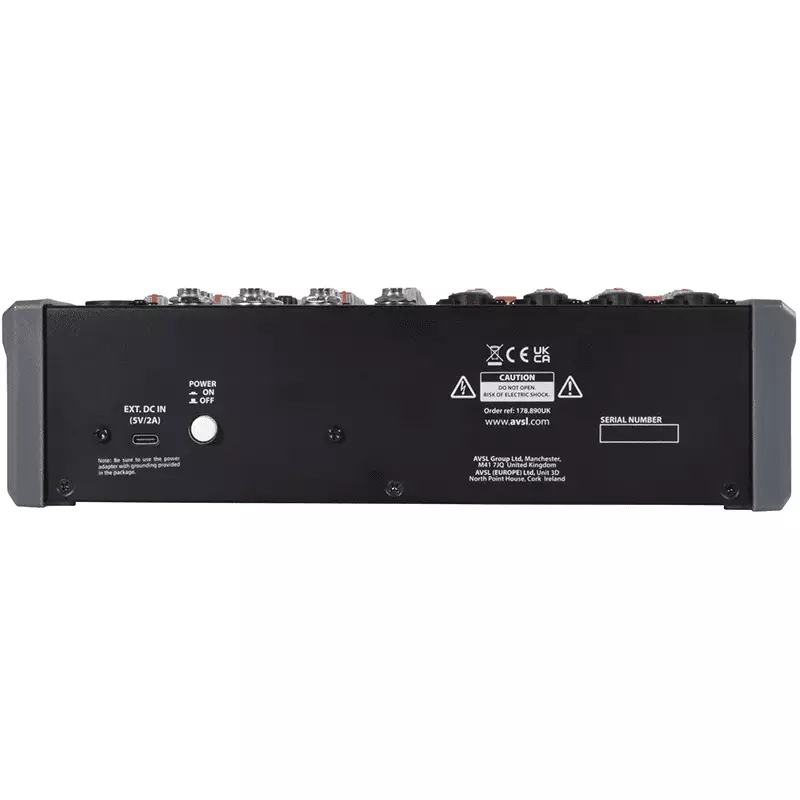 - Outputs: Main L+R XLR, L+R Monitor 6.3mm, Headphones 6.3mm