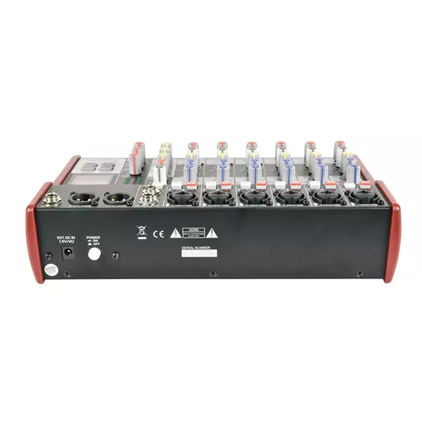 Compact format audio mixer with 2, 4 or 6 mono input channels and a stereo line input. Each mono channel has a combo XLR/jack input with individually switchable mic/instrument impedance and +48V phantom power for the XLR. Input channels have High/Low EQ and Pan controls and mono channels also have Effects level to vary the amount of internal digital delay effect added for vocals or instruments. An internal player/recorder with backlit display can accept a USB memory stick containing compressed audio files in various formats or alternatively connect to a smart phone via BT wireless link. Output is delivered on a pair of balanced XLR connectors and offers very low noise operation for high quality studio or live performances.