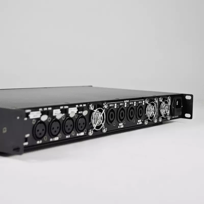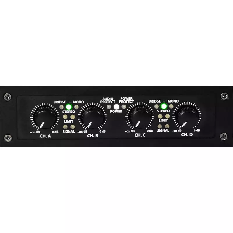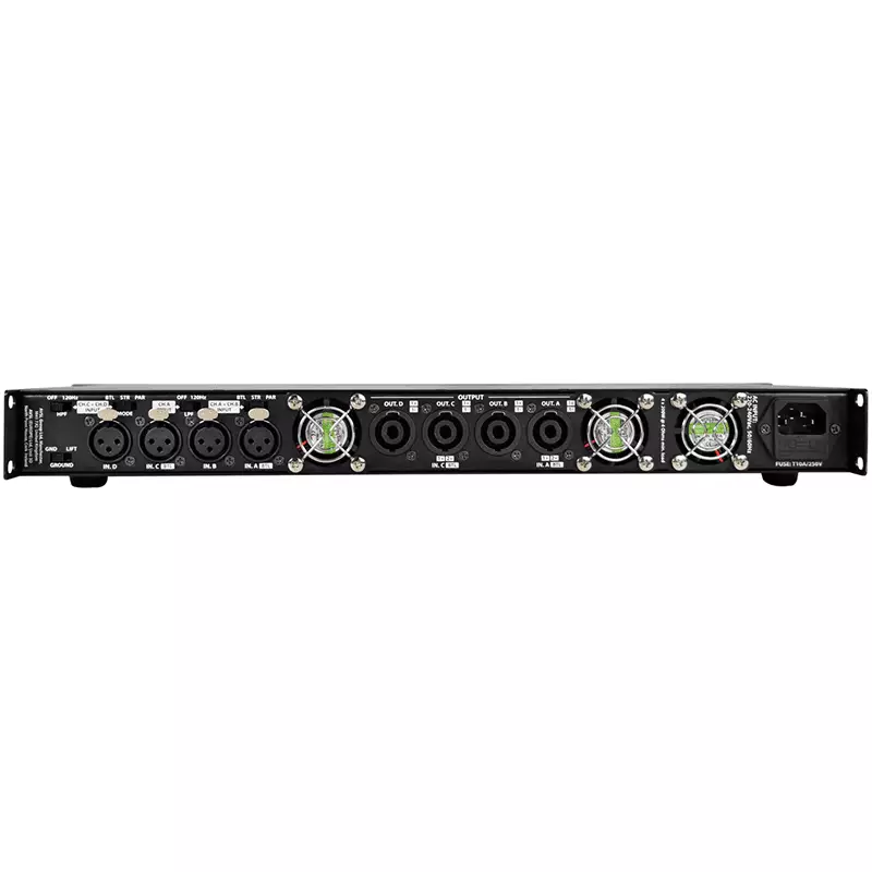 Quad digital power amplifier in a lightweight 1U rack-mountable format. An energy-efficient switch-mode power section and class-D amplifiication circuit delivers accurate power-on-demand to four independent speaker outputs. Proprietary cool guide technology provides stable temperature management for dependable operation. Each pair of output channels can be separately parallel switched or bridged as a full or part stereo amplifier configuration. For channel A, there is a switchable 120Hz low-pass filter for use with subwoofers and a channels C and D have a switchable stereo pair of 120Hz high pass filters to effectively focus power in full-range cabs operating as mid-tops in conjunction with sub-woofers. For permanent or mobile installations, the D-series offers an invaluable and flexible problem solver for audio designers and sound engineers.