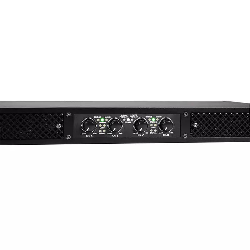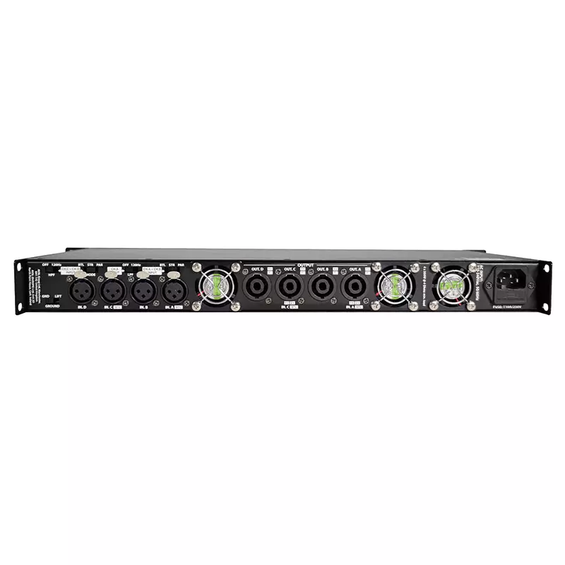 Quad digital power amplifier in a lightweight 1U rack-mountable format. An energy-efficient switch-mode power section and class-D amplifiication circuit delivers accurate power-on-demand to four independent speaker outputs. Proprietary cool guide technology provides stable temperature management for dependable operation. Each pair of output channels can be separately parallel switched or bridged as a full or part stereo amplifier configuration. For channel A, there is a switchable 120Hz low-pass filter for use with subwoofers and a channels C and D have a switchable stereo pair of 120Hz high pass filters to effectively focus power in full-range cabs operating as mid-tops in conjunction with sub-woofers. For permanent or mobile installations, the D-series offers an invaluable and flexible problem solver for audio designers and sound engineers.