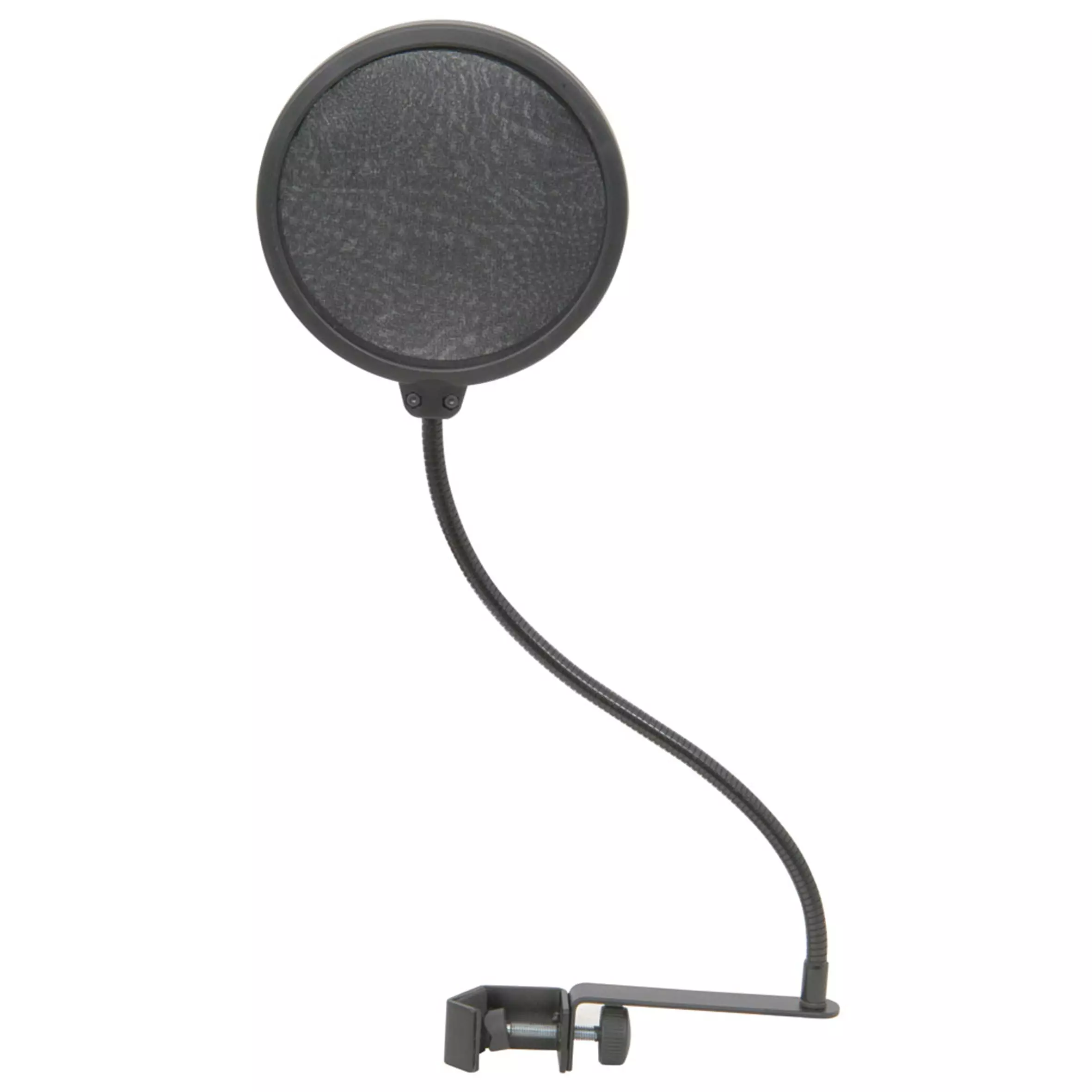 Round pop screens for use with studio microphones attached to a mic stand by a flexible neck and adjustable for optimum positioning.