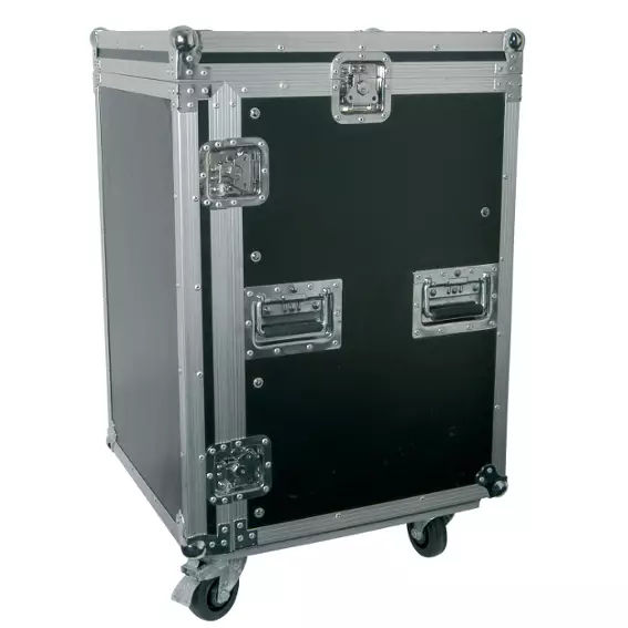 Mobile equipment rack with facility to mount a 19″ (10U) mixer on top of the unit.