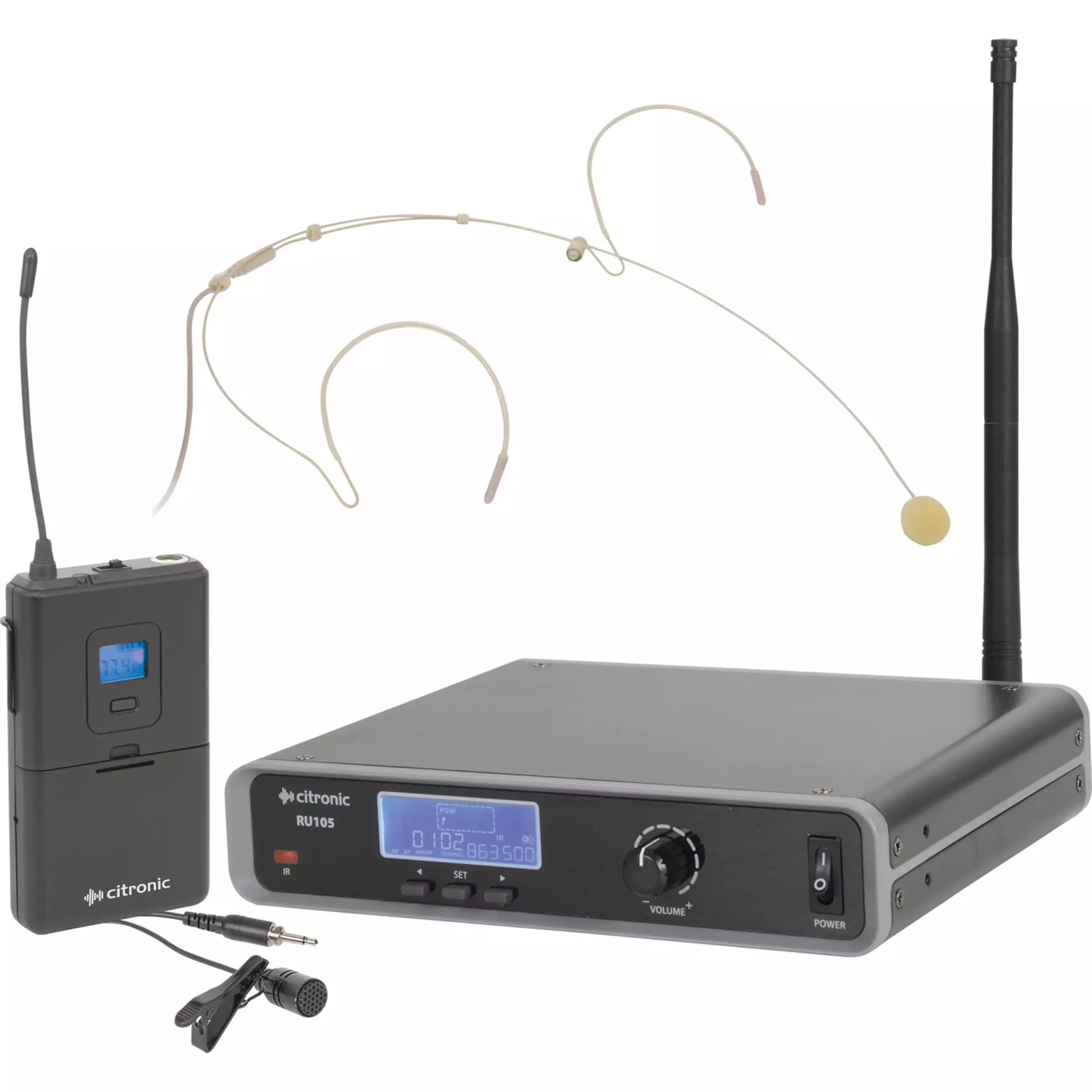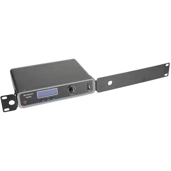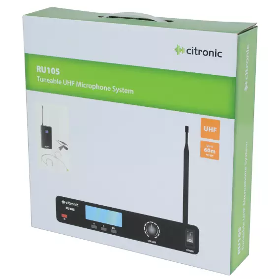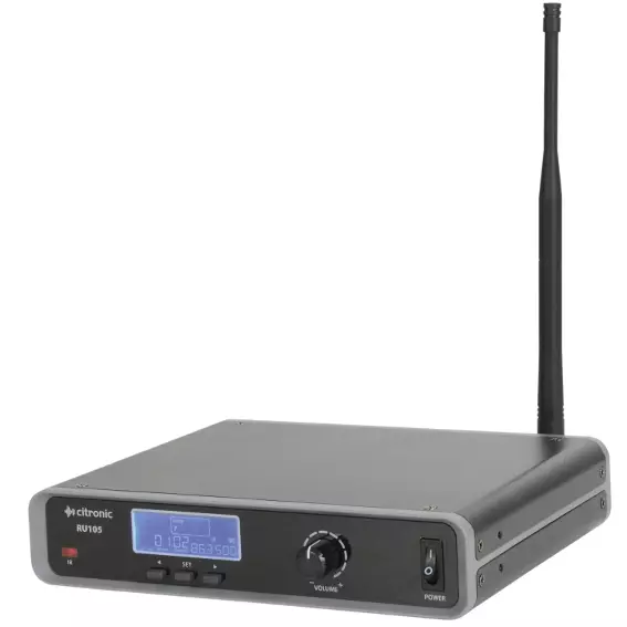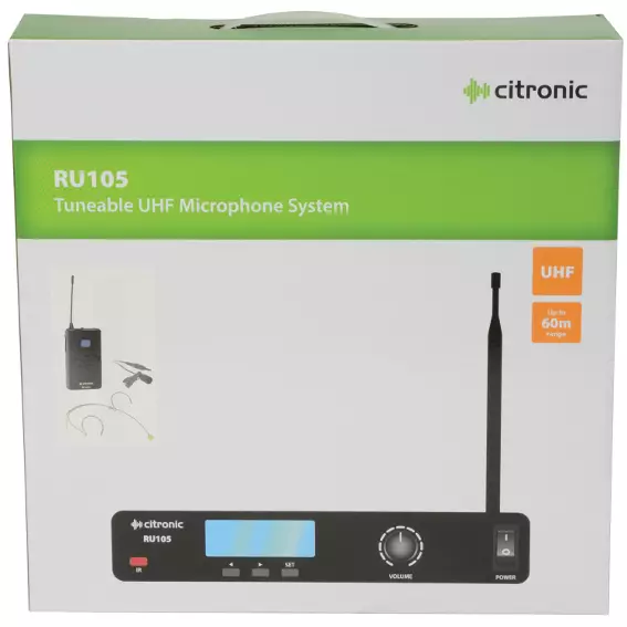 Single channel PLL tuneable UHF wireless system with beltpack transmitter and a choice of neckband microphones or lavalier microphones. The receiver unit is compatible with standard 19″ racks using the included rack ears and front mounting antenna accessories. The RF carrier frequency is selected on the receiver and synchronized to the transmitter via infra-red at the touch of a button. Up to 4 RU105 systems can be operated together on the EU licence-free band.