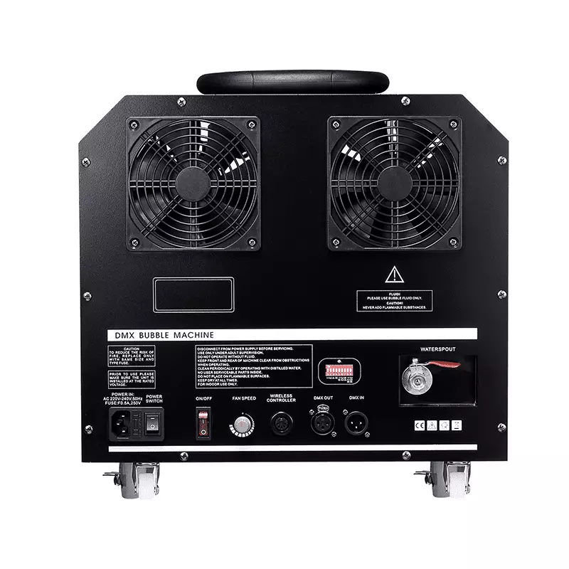 The P-1000Y with dual wands and fans creates enormous quantities of big bubbles while also creating an updraft allowing the bubbles to rise high in the air. Plastic fluid tank prevents corrosion and leaking. Handles and built-in wheels make transport easy.