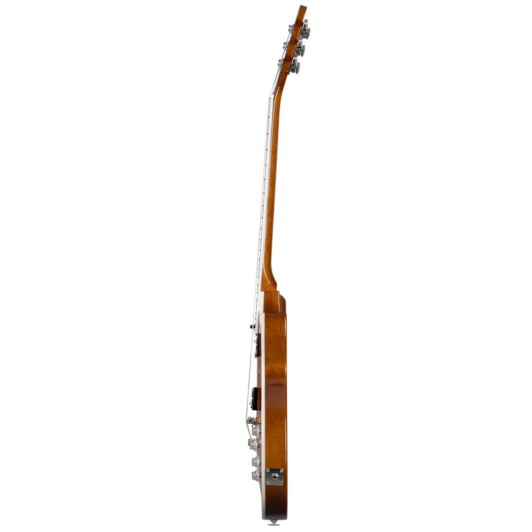 The Epiphone EILM-MOB Les Paul Modern Figured Mojave Burst is a sleek, modern twist on the classic Les Paul. Its weight-relieved mahogany body, paired with a maple top and AAA flame maple veneer, offers stunning looks and rich tone. The asymmetrical SlimTaper mahogany neck profile provides excellent playability, while the ebony fingerboard with trapezoid inlays adds a refined touch. ProBucker 2 and 3 pickups deliver diverse tones, enhanced by coil splitting and phase switching. Additional features include Grover Locking Rotomatic tuners for stable tuning, a LockTone Tune-O-Matic bridge, and a Stop Bar tailpiece for lasting sustain. A premium gig bag is included for safe storage.