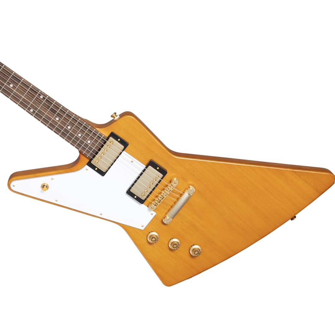 The Epiphone IGCKEXW-ANA-L 1958 Korina Explorer Natural L.Hand beautifully recreates the legendary 1958 Explorer. Crafted with the Gibson Custom Shop, this left-handed guitar features a solid Korina body and neck, producing warm, resonant tones and excellent sustain. The 1958 Explorer neck profile, combined with a laurel fingerboard, ensures smooth playability for rhythm and lead parts. Its aged gloss finish showcases Korina’s natural beauty, while the 4-ply white pickguard and gold hardware add vintage elegance.