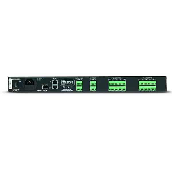 The DMM 8008 is a high performance 8 input x 8 output digital matrix mixer Specially designed for commercial and professional application such as Conference rooms, Auditoriums, Sport utility buildings, House of worship, Pubs and Disco. It includes 8 independently switchable Line/ Mic inputs with Phantom power supply, 8 Line outputs, managed by a powerful 48kHz 24 Bit DSP engine, in addition to high performance 24 Bit AD/DA converters.