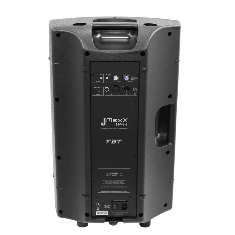 The new FBT JMaxX 114A combines ease of use and versatility for many portable or installed sound applications: musicians, DJs, AVL contractors, rental sound reinforcement, corporate events, houses of worship, bars and clubs. With its eye-catching gas-injected forms designed to virtually eliminate undesired enclosure resonance and reinforce strong low frequency performance, the 14-inch JMaxX 114A is equipped with FBT’s latest 90° x 60° HF horn design which delivers improved projection, accuracy, and dispersion of the mid and high frequencies. Providing a myriad of possibilities for bands, DJs and solo artists, as well as for permanent installations, the JMaxX 114A is actually four loudspeakers in one. Derived from a decade of experience of portable sound reinforcement, the carefully tailored equalization presets offer highly intelligible response for vocals and floor monitoring; slightly boosted response in lounge bar applications; punchy and forward sound for DJs and night venues; and a general-purpose EQ setting that mirrors the original and familiar FBTMaxX voicing. The JMaxX 114 A features FBT’s latest generation lightweight 700W + 200W Class D power amplifier with universal switch mode power supply, delivering abundant power and headroom to reproduce even the largest transients without distortion. And a unique 14 Inch Low frequency driver. The 14″ Driver fits inside a cabinet the size of a 12″ Cabinet yet performs as good as a conventional 15″ This unique speaker. The result is an amazingly compact speaker with all the power and clarity of a much larger speaker and weighing Just 14Kg this Speaker is a dream to transport. XLR inputs and outputs, volume control, the EQ presets and filters, and ground lift switch are all conveniently located on a clearly laid out rear panel, making loudspeaker setup and operation intuitive and consistently repeatable. The JMaxX versatility is further underscored by the many mounting and fixing options that the ergonomically styled cabinets provide. Mounting in fixed installations is made easy using the M10 suspension points or wall bracket flange plates, while portable use is facilitated by the built-in 35mm pole mount socket. There’s no need for separate stage monitors, as JMaxX’s cabinet profiles are designed with 14°, 40°, and 55° wedge angles, and when used with the specific floor monitoring EQ presets, will ensure that performers hear themselves with ultimate clarity. Weighing just 14Kg and Packing a genuine 900 Watts RMS The JMaxX 114A is setting a new standard in compact affordable lightweight speakers.
