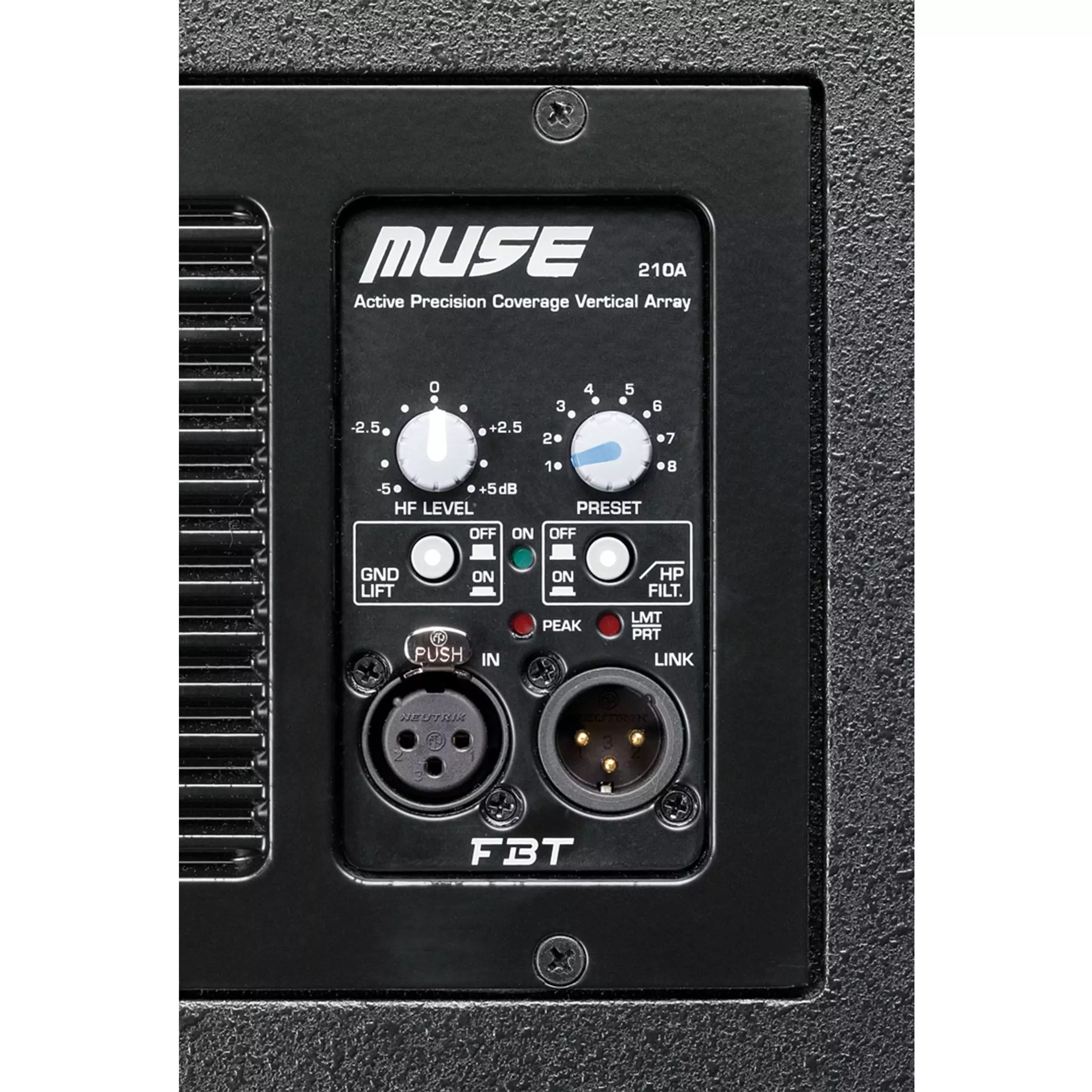 A true line array system ancompassing advanced technology and refined italian engineering, these are the principles behind MUSE, a new sound reinforcement solution from FBT that redefines the modern line array in terms of power, size, light weight, flexibility and ease of use. The MUSE 210LA is the ideal choice when line array performance is needed and a fast and easy set up is a must. The modularity of the FBT MUSE 210LA makes it extremely flexible for a wide range of applications, from a small two cabinets PA system to an elaborate line array system consisting of up to 16 FBT MUSE 210LA cabinets along with multiple FBT SUBLINE 218SA subs for large concert events. The system features 2 x 10″ woofers with 2.5″ voice coil and two custom B&C HF compression drivers with 1″ throats. The system is powered from a 600W RMS amplifier in Class D technology for LF and a 300W RMS amplifier for HF; the amplifier features a solid lightweight die-cast aluminium structure that permits to protect the electronics against dust, avoid any air loss through the controls and maximize heat loss by using the woofer ventilation instead of a cooling fan. The waveguide, optimized by BEM finite element simulation, offers 90° horizontal dispersion engineered to be perfectly integrated with the HF compression driver it allows the dispersion of a flat acoustic wave to over 18kHz. The FBT MUSE 210LA cabinets coupling hardware is internally integrated and allows the suspension of 16 arrays with a splay angle between 0° – 10° with 1° step. The onboard DSP offers a choice of eight presets, allowing users to easily configure their MUSE 210LA system depending on the curvature of arrays and the number of speakers used. 3 status LEDs, On/Peak/Lmt-Prt, are provided for monitoring the system. FBT MUSE 210LA cabinets are moulded on a 0,59″ (15mm) birch plywood, and incorporate two die cast aluminium handles; the front is protected by a heavy duty metal grille with anti-resonance spacers and exclusive synthetic cloth to protect the drivers. The FBT MUSE 210LA provides a wide range of hardware accessories for flying and ground stacked configurations.