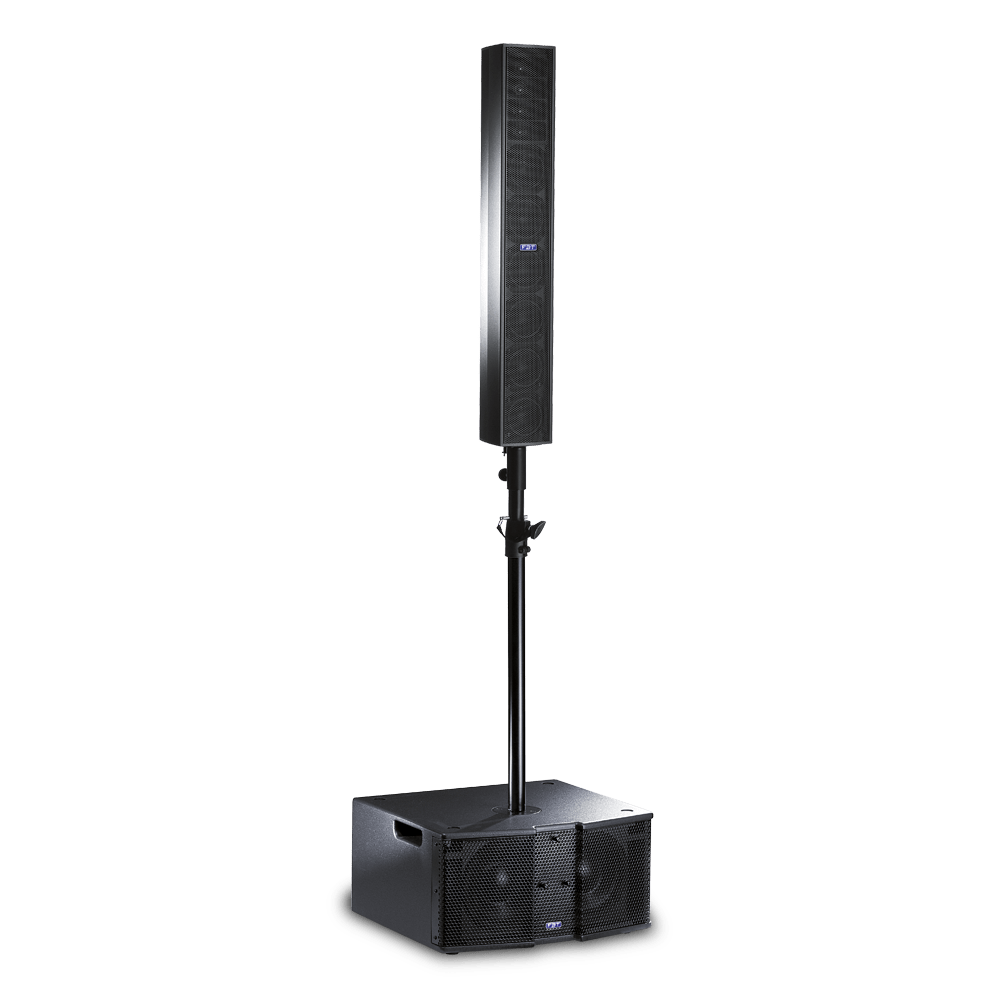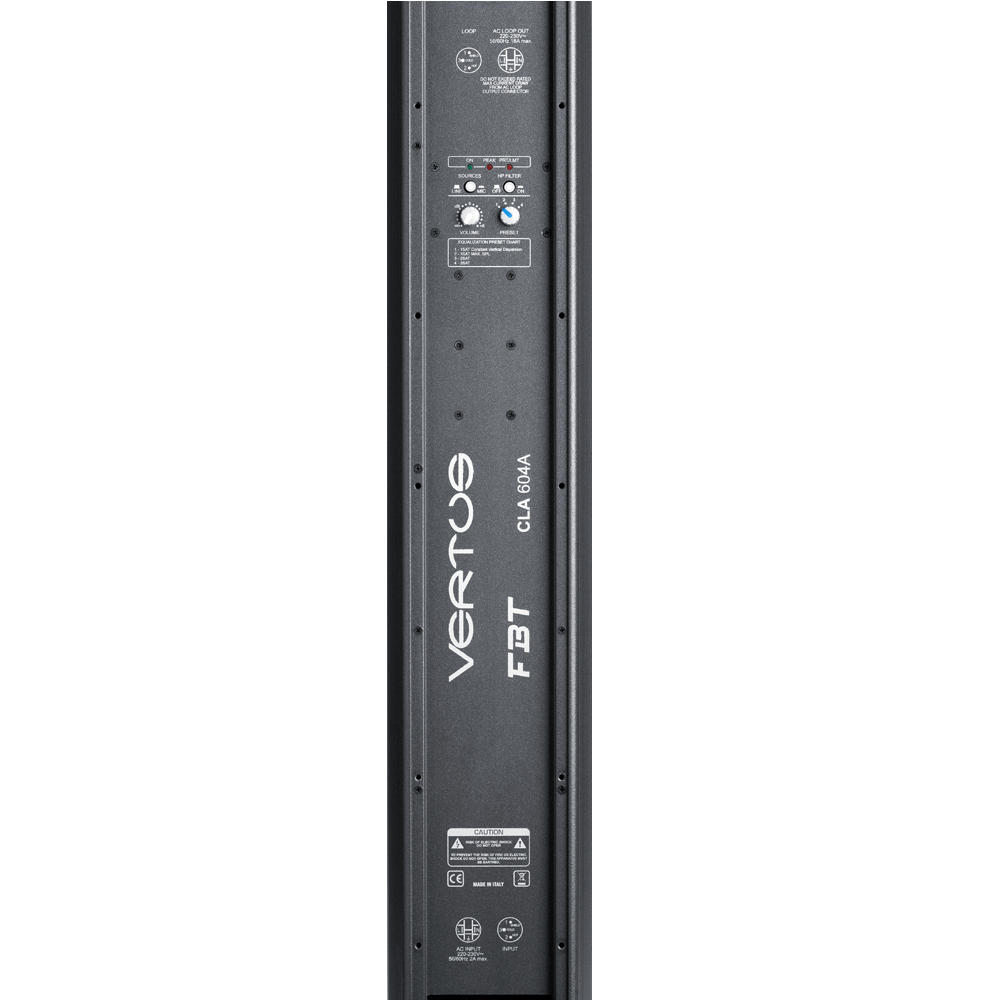 The FBT VERTUS CLA 604A two-way bi-amplified speaker system incorporates 6 x 4” custom woofer with 1” voice coil and 4 x 1″ neodymium dome tweeter on waveguide. FBT VERTUS CLA604A The internal Class D amplification, 400W for woofers, 100W for tweeters and DSP processor with 4 equalization presets provide unexpected dynamics in a system of these dimensions. The FBT VERTUS CLA604A shall meet the following performance criteria: frequency response of 130Hz to 20kHz, maximum SPL of 125dB. The FBT VERTUS CLA604A provides a DSP with 4 EQ presets. The feature an extruded aluminum construction and the front shall be protected by a heavy duty metal grille. The control panel provides volume, preset, HP filter, sources switch, 3 status led ( on, peak, prt/limit ), XLR input and Neutrik Powercon supply input at the lower part of the column and XLR link and Neutrik Powercon loop out at the higher part. Superior as well as inferior latching system, enables the extension of the lenght of the line array adding CLA 604Amodules for a greater modularity of the system and possibility to angle the columns of ±30° on the horizontal plane. The rapid latching system with pins allows for the expansion of the system, doubling-up CLA 208 SA modules to form a unified column with an absolute and coherent source integration