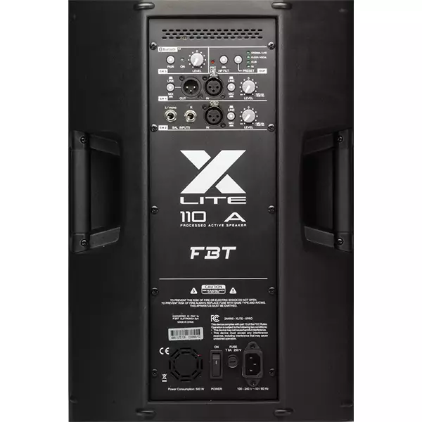 The bi-amplified FBT XLITE 110A active speaker feature a 1200W low frequency amp and a 300W high frequency amp. The control panel features a three-channel mixer with two micro-line inputs, a stereo input and a dedicated channel for bluetooth 5.0, two XLR inputs, stereo input, XLR output with ch1 or mix link selector, HP filter, two mic-line selectors, DSP preset selector, Bluetooth 5.0 with pairing led. 4 x M10 rigging points built-in into the cabinet along with the optional mounting brackets allow the FBT XLITE 110A speaker to be surface mounted on walls or ceilings.